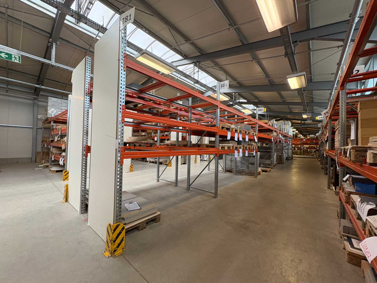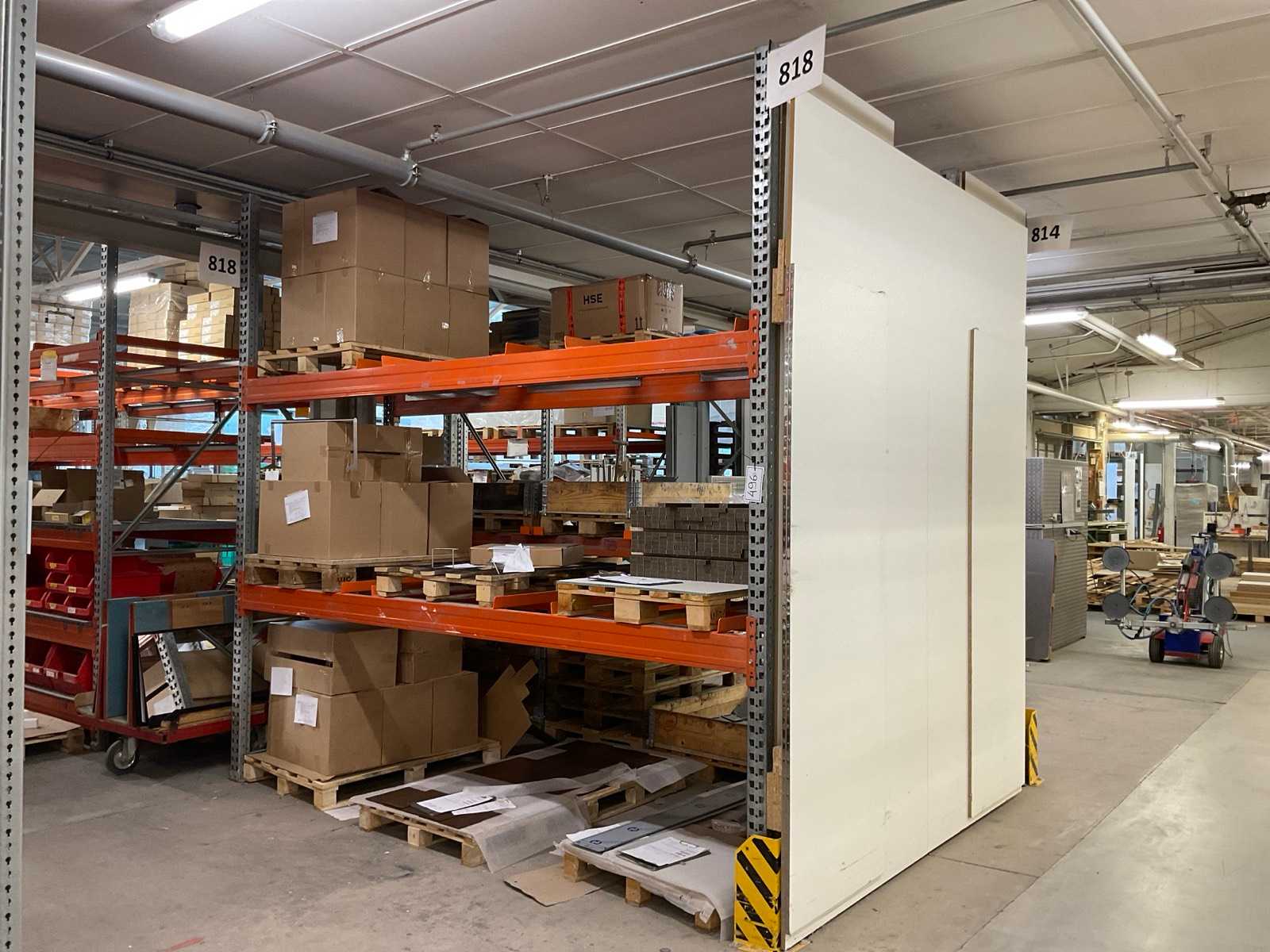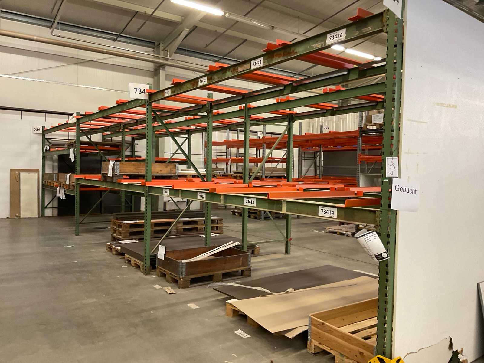 Heavy-duty shelf consisting of: 4 uprights approx. 1140x2900mm, 14 trusses approx. 4000mm, incl. pallet holders, with contents Auction-ID: A7-45254-416