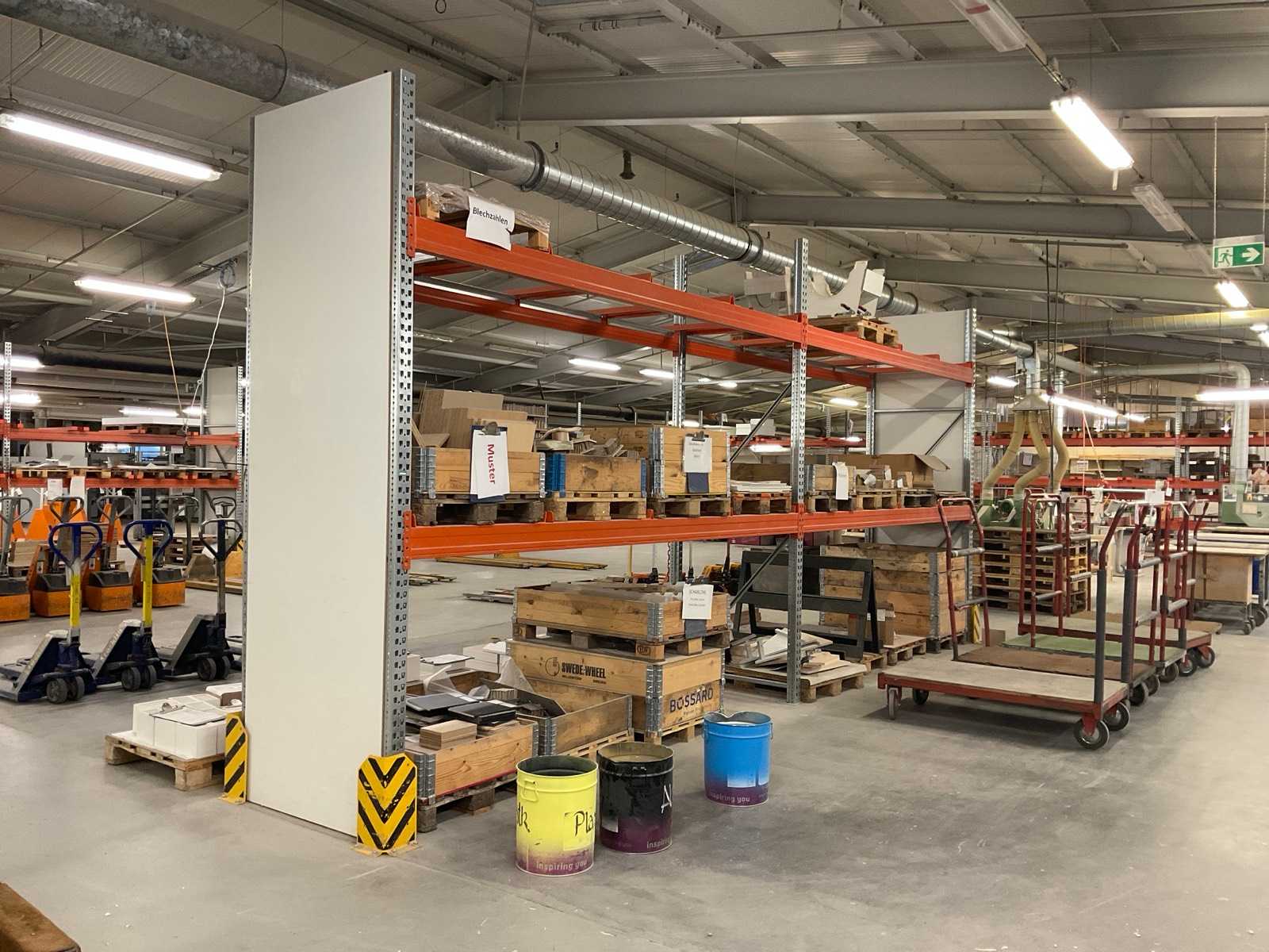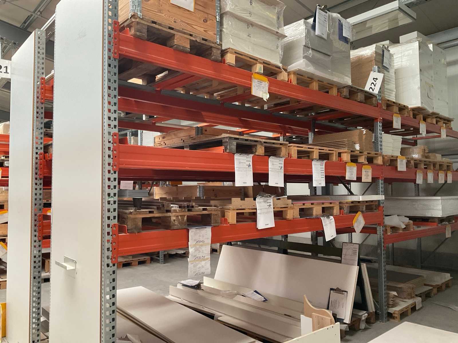Heavy-duty shelf consisting of: 4 stands approx. 1100x3300mm, 22 trusses approx. 3600mm, incl. pallet holders, with contents Auction-ID: A7-45254-604