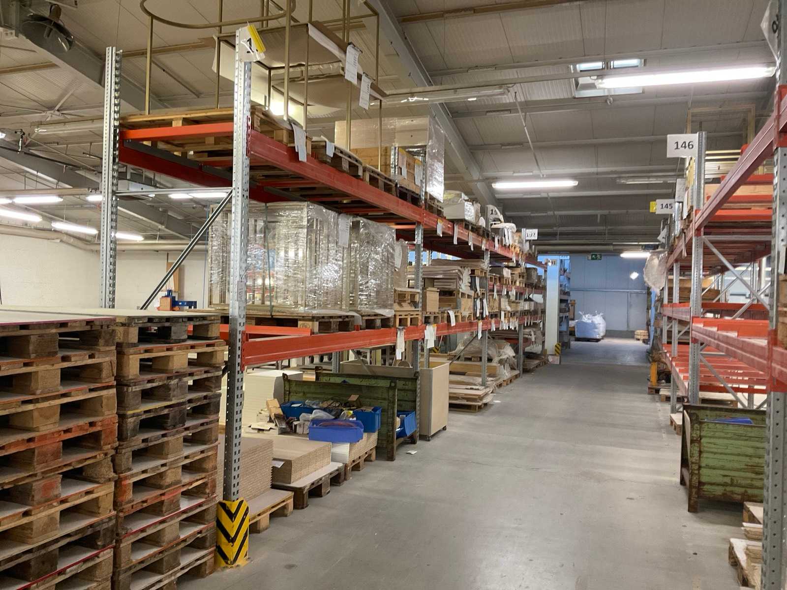 Heavy-duty shelf consisting of: 4 stands approx. 1100x3300mm, 1 stand approx. 1100x3000mm, 22 trusses approx. 3600mm, incl. pallet holders, with contents Auction-ID: A7-45254-491