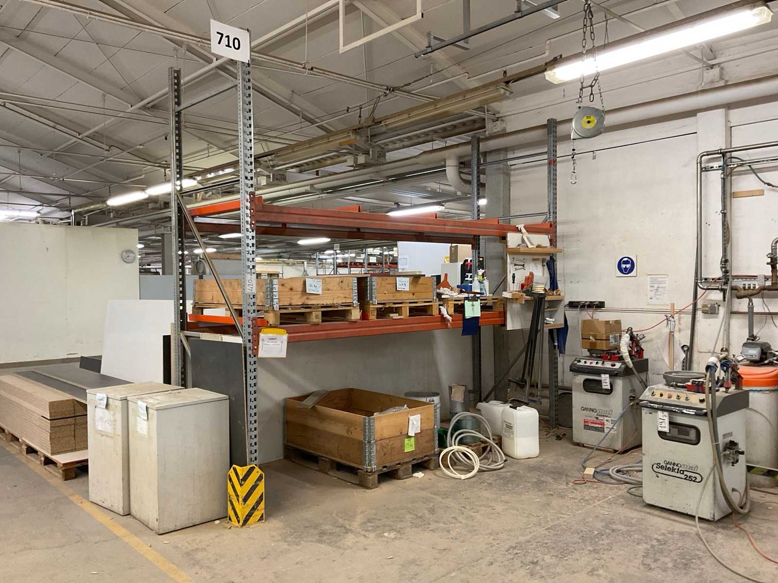 Heavy-duty shelf consisting of: 2 uprights approx. 1100x2700mm, 4 trusses approx. 3600mm, incl. pallet holders, with contents Auction-ID: A7-45254-430