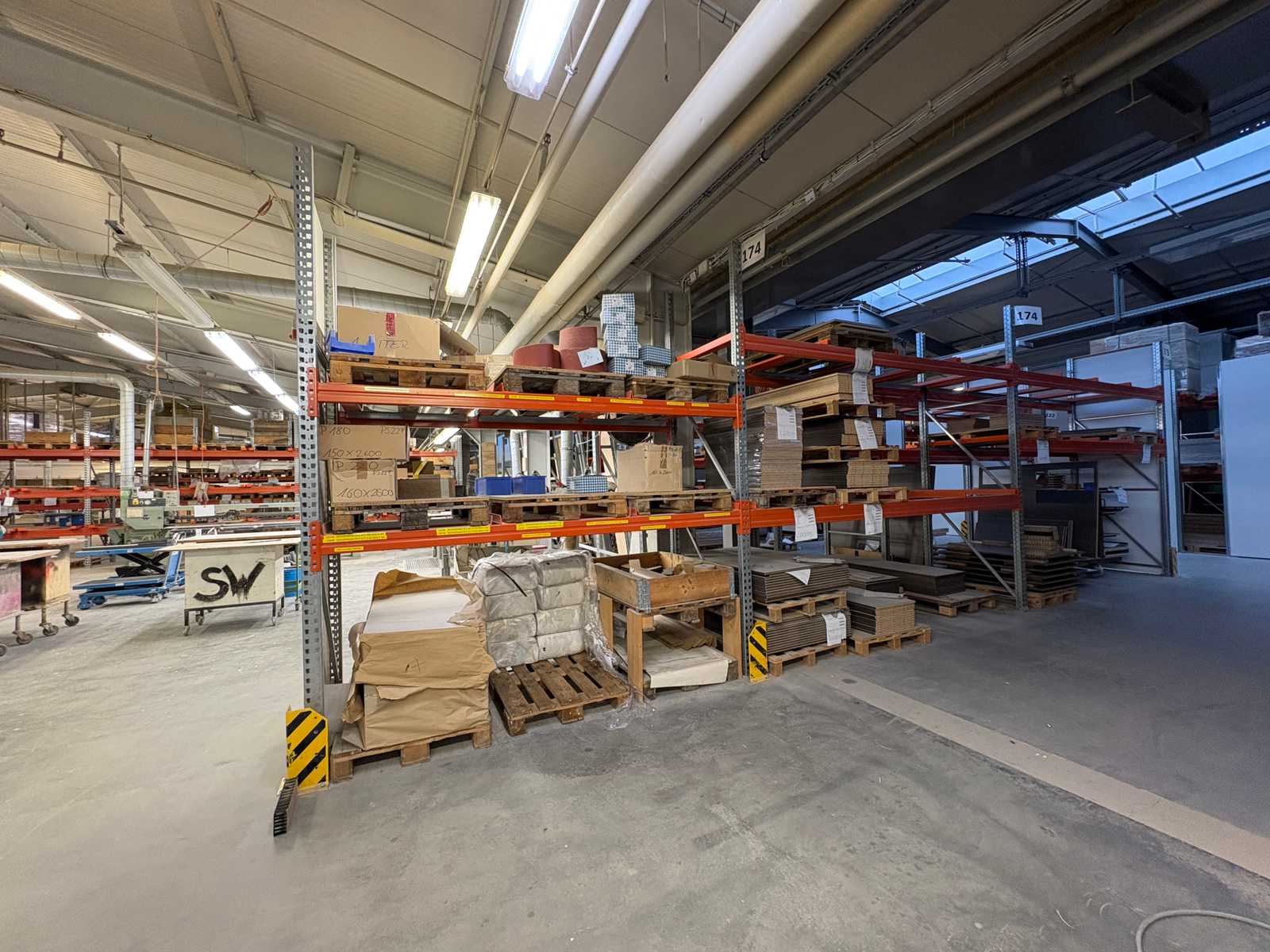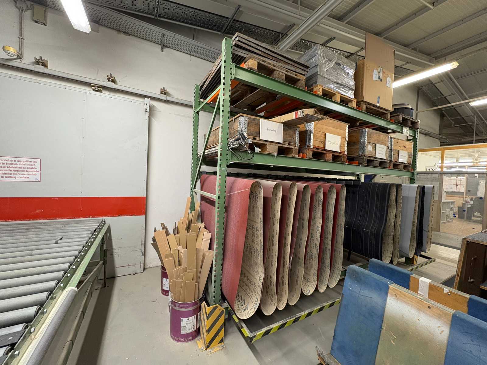 Heavy-duty shelf consisting of: 2 stands approx. 1100x3300mm, 4 trusses approx. 3600mm, incl. pallet holders, with contents Auction-ID: A7-45254-420