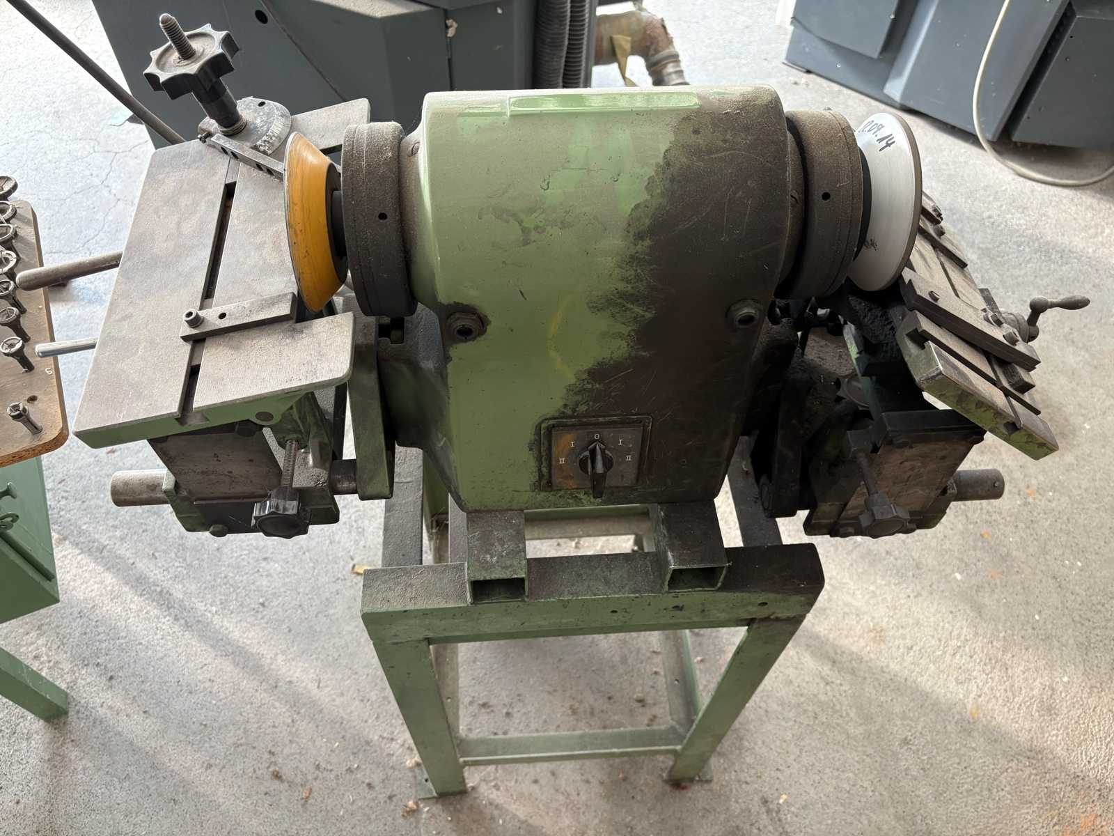 Universal Tool Grinding Machine Two grinding wheels: diamond and corundum wheel Individually adjustable supports Finely adjustable guides and angle adjustments Electric motor with two-stage speed control (switching stages I / II) Stable cast iron body for low-vibration running High grinding accuracy Technical data (approx.): • Grinding wheels Ø: 125–150 mm • Motor power: 0.55 kW • Speed: 1,400 / 2,800 rpm • Electrical connection: 380 V three-phase current • Dimensions (L×W×H): 700 × 500 × 900 mm • Weight: approx. 90 kg Special features: • Two grinding wheels (diamond / corundum) • Stable angle adjustment devices • Solid cast iron housing with stable frame • Ideal for toolmaking, maintenance and precision workshops Auction-ID: 03U-EV4-5