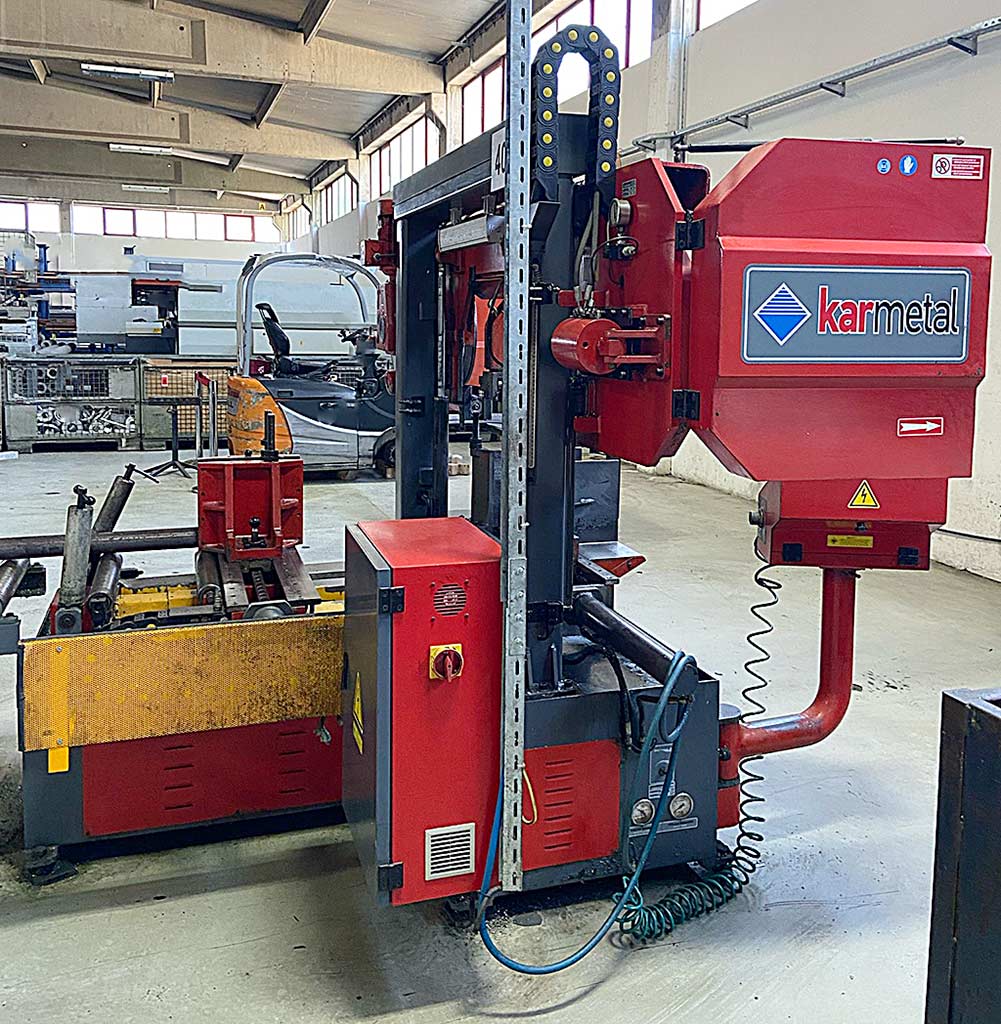 Lg.Nr. 24029 Özellikler: - 400 mm'ye kadar testere bıçağı çapı - 90'da yaklaşık 130 mm kesme aralığı - Kare 120 mm - Dikdörtgen 300 x 40 mm - veya 240 x 85 mm - 45'te yaklaşık 130 mm - Kare 110 mm - Dikdörtgen 245 x 40 mm - Gönye ayarlanabilir Li + Re her biri 0 - 90 - 2 kesme hızı 13 + 26 m/dak - Sürücü 400 V / 1,2 / 1,8 kW - Testere bıçağının besleme hızı hidr. Sonsuz değişken - Soğutma sıvısı cihazı - Malzeme ikmal makinesi - Alan gereksinimi yakl. G 2400 x Y 1850 x D 1100 mm - Ağırlık yakl. 1250 kg