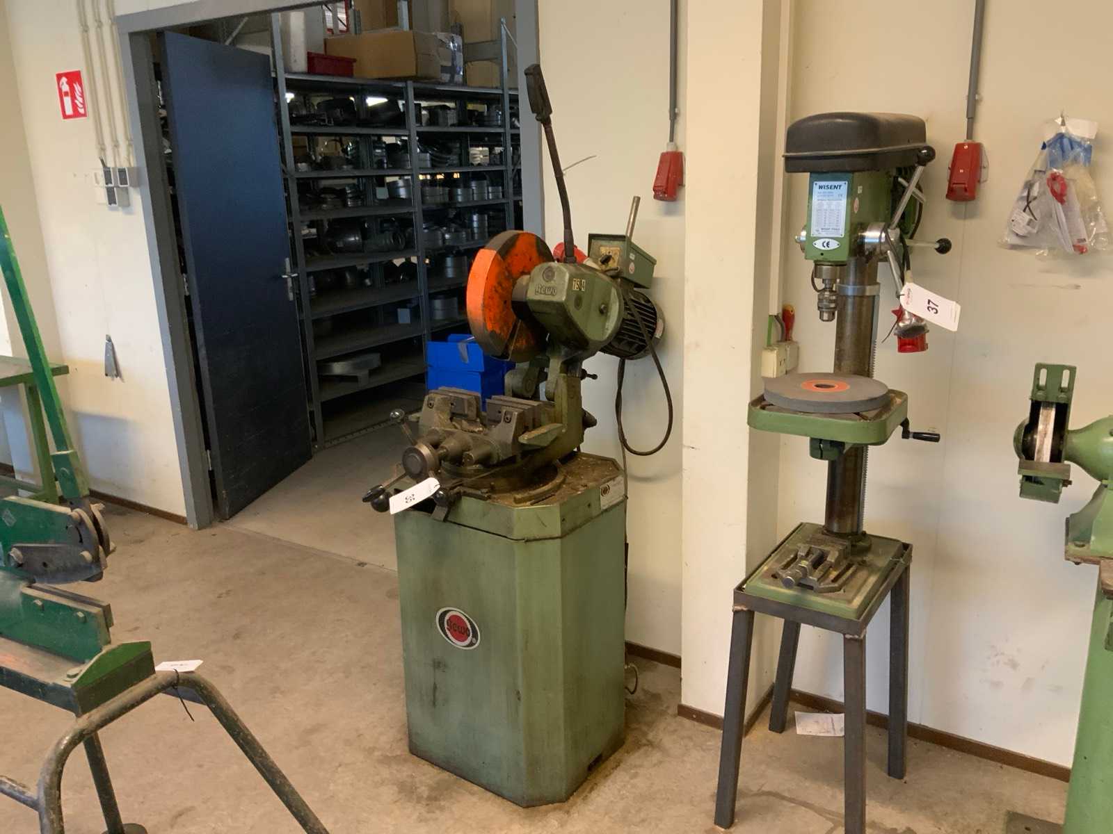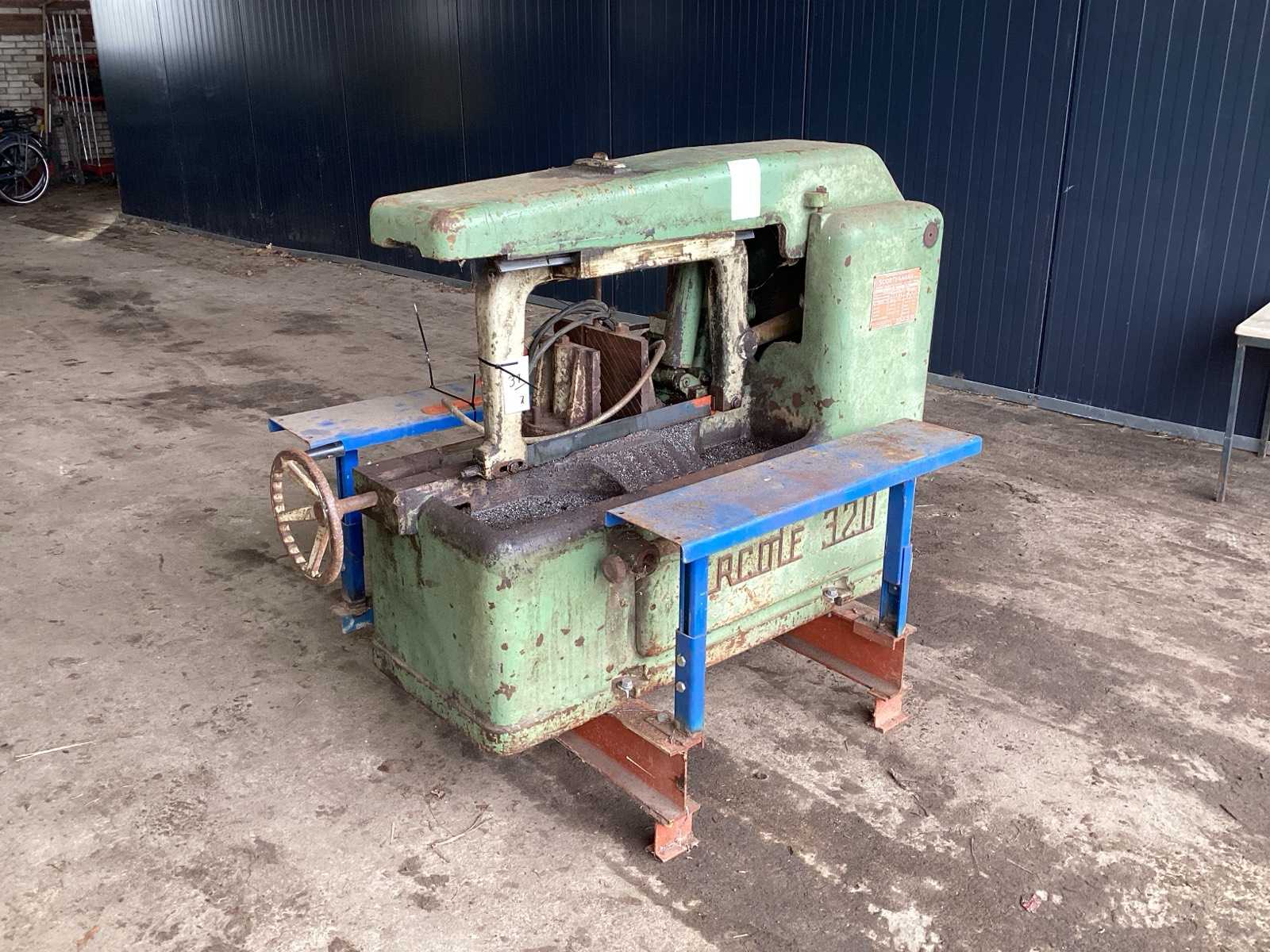 Horizontal metal band sawing machine, often used for cutting metal profiles and pipes to size. Serial number: 2010 Date: Speed: 20 - 29 - 51 m/min Max. cutting capacity 90°: 128 mm Saw blade specifications: 1640 x 13 x 0.6 mm Voltage: 1/N/PE AC 230 V 50 Hz Power: 550 W Degree of protection: IP 54 Weight: 95 kg