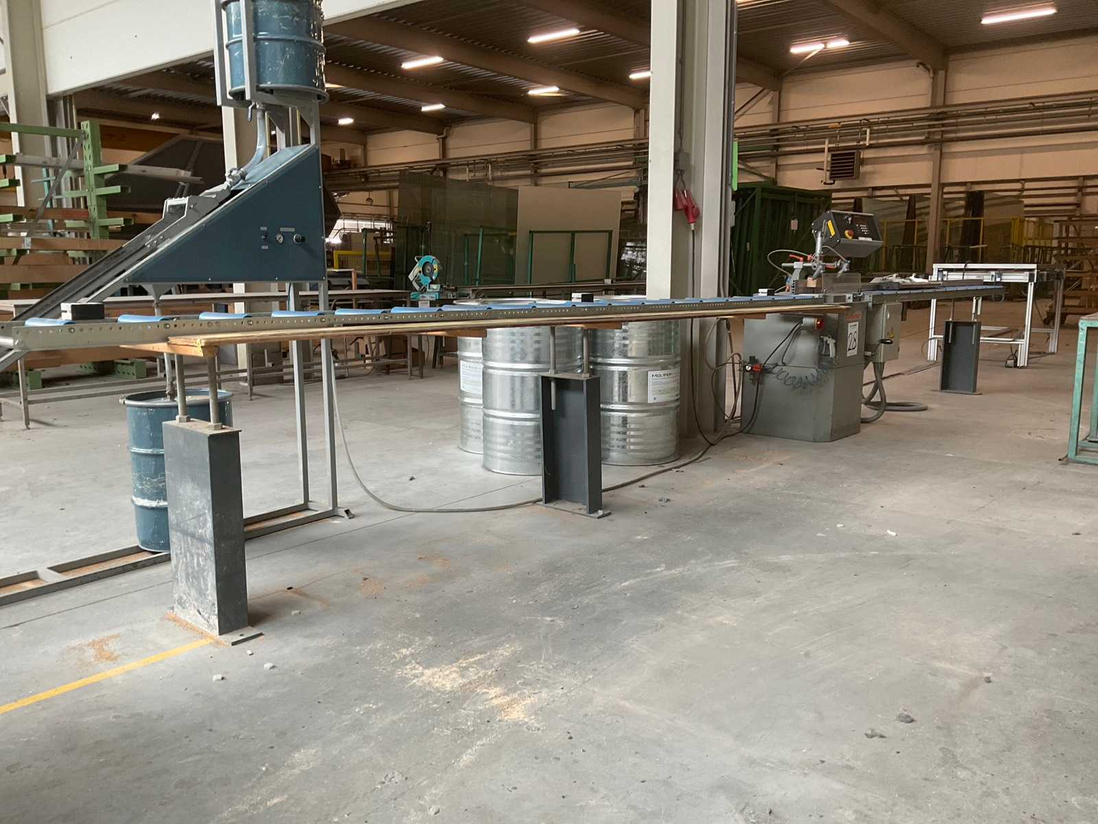 Equipped with: feed conveyor, 380x2200x107mm including hand stop, output conveyor, 350x5050x105mm, 1x box with saw blades