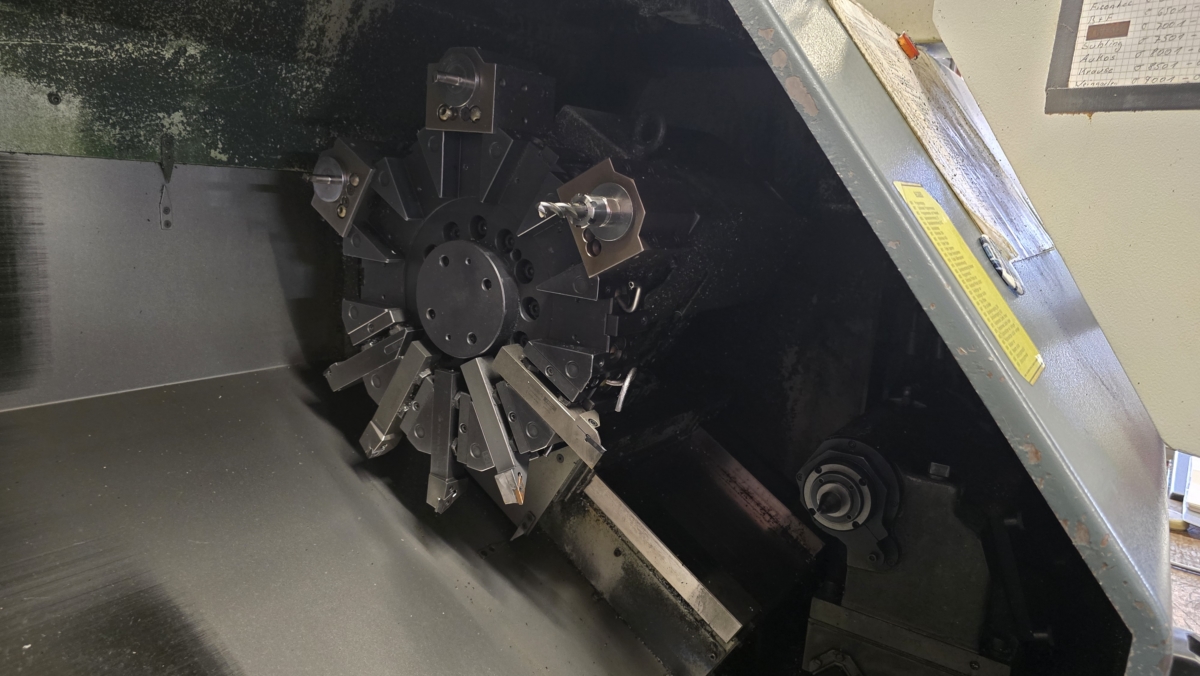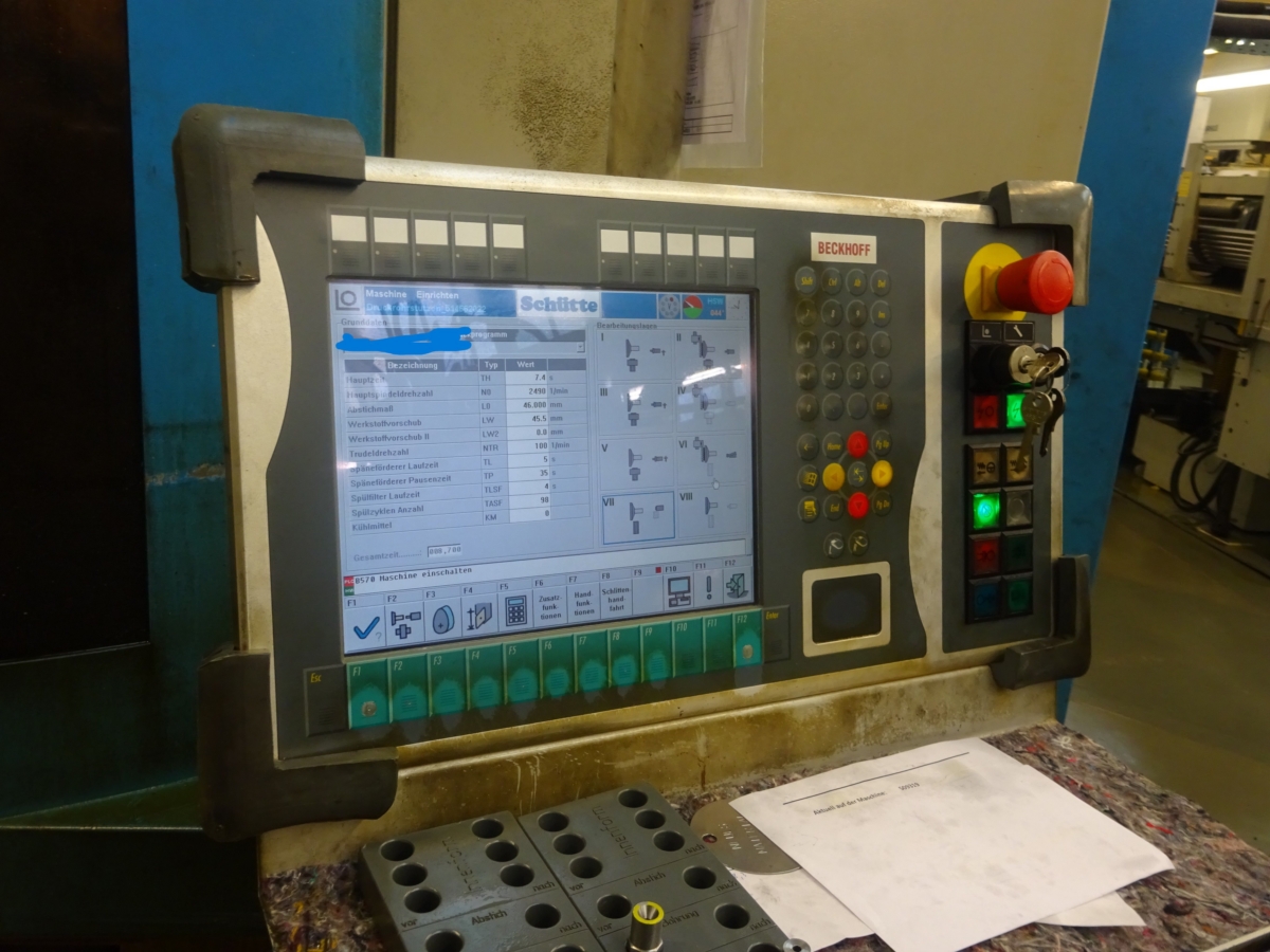 number of spindles: 8 spindle passage: 36 mmturning length: 250 mmspindle bearing diameter: 358,2 mmbar material dia.: 36 mmbar length: 4000 mmlongitudinal slide -travel: 145 / 250 mmcross slide - travel: 80 mmspindle turning speed - stepless: 560 - 4000 U/minspindle motor: 28 kWTotal weight, approx.: 8500 kgdimensions of the machine ca.: 5850 x 1900 x 2580 mmxmmxmm- Beckhoff CNC control system (Win2000)- IEMCA 4m bar feeder (PRA52/P-Typ42)+ Hydraulic catch chute+ Mechanical end-piece chute with container+ Parts conveyor belt+ 3–4 bar oil connection+ 100 bar high-pressure connection+ 1 HYDAC hydraulic oil cooler+ 1 oil cooler for cutting oil+ 1 chip conveyor+ 1 magnetic roller for sludge removal+ 1 new air conditioning unit for control cabinet / year of manufacture 2025+ Feed block: new brass strips fitted in 2023, making the machine as good as new+ Spindle couplings 2nd, 4th and 6t ...