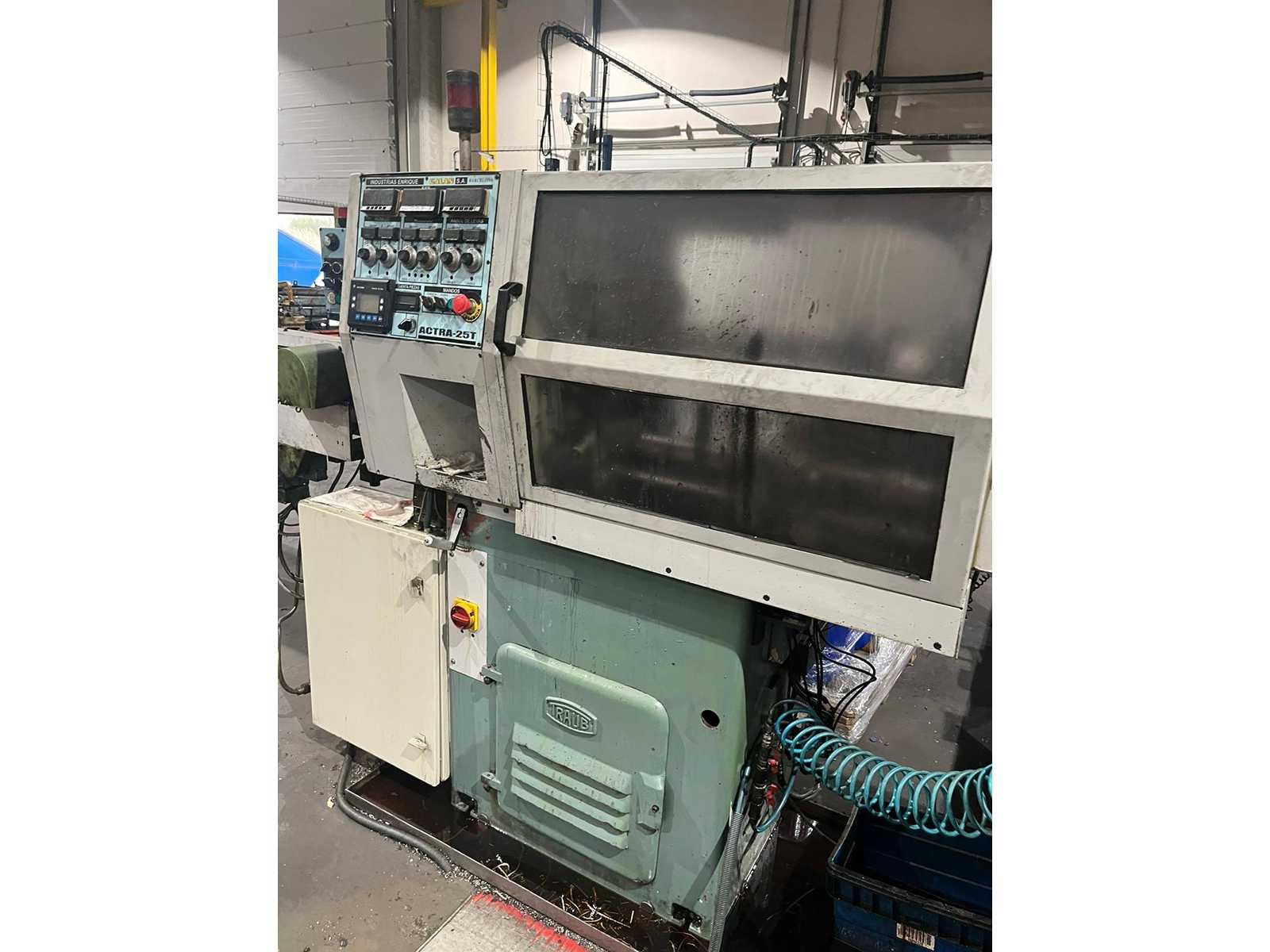 TRAUB automatic multi-spindle CNC lathe line equipped with ACTRA-25T control. Includes BECHET (France) bar feeder, serial number 148. Equipped with chip conveyor and automatic parts evacuation system. Fully automated loading and unloading system. Machine with closed protection cabin. Configuration oriented to high-cadence mass production. Suitable for machining small and medium-sized parts. Control panel with manual controls and CNC control. Source of the feeder: Cluses, Haute-Savoie (France). It is sold as a complete line consisting of lathe, bar feeder and evacuation system. Auction-ID: A7-44864-3