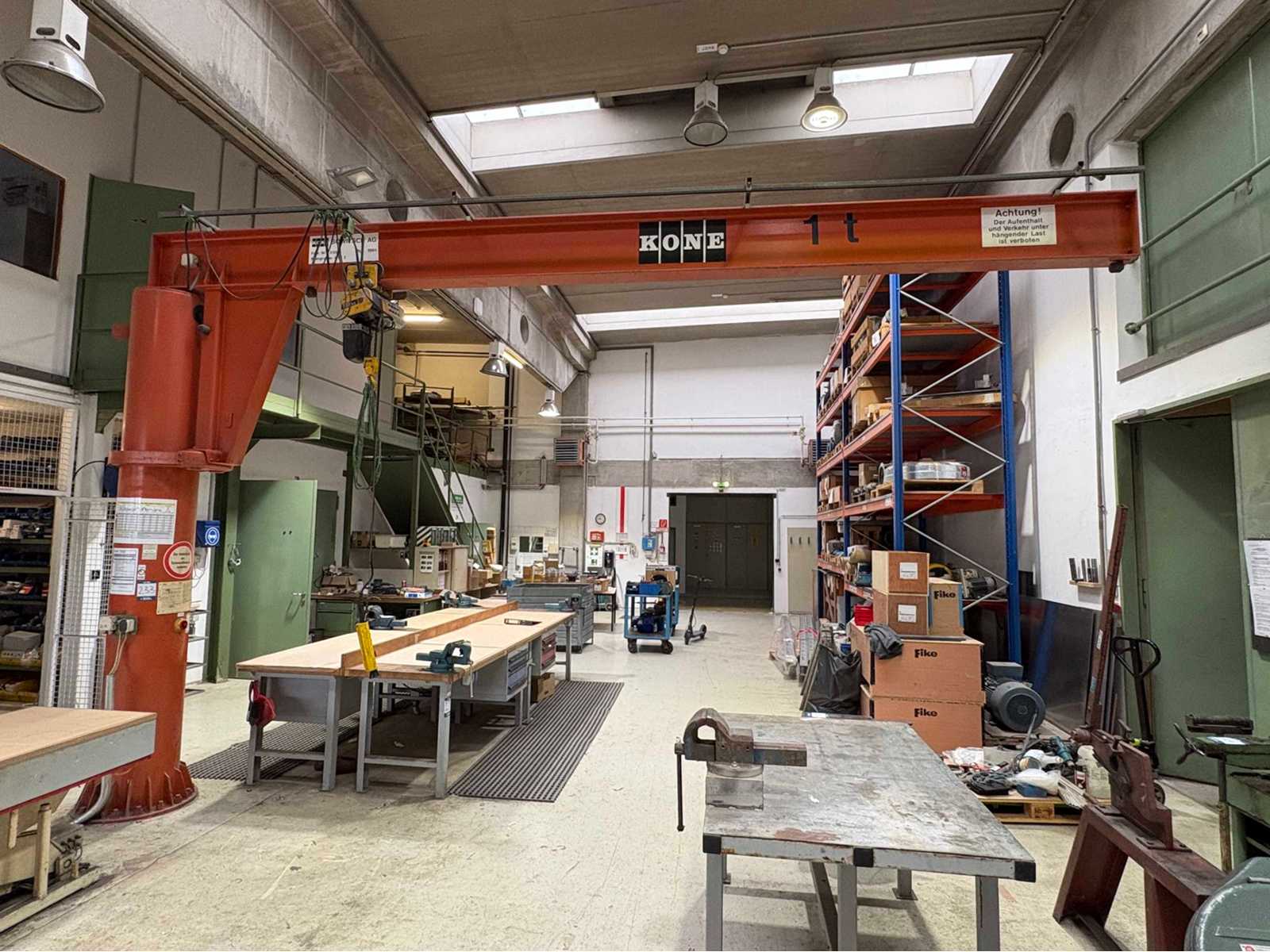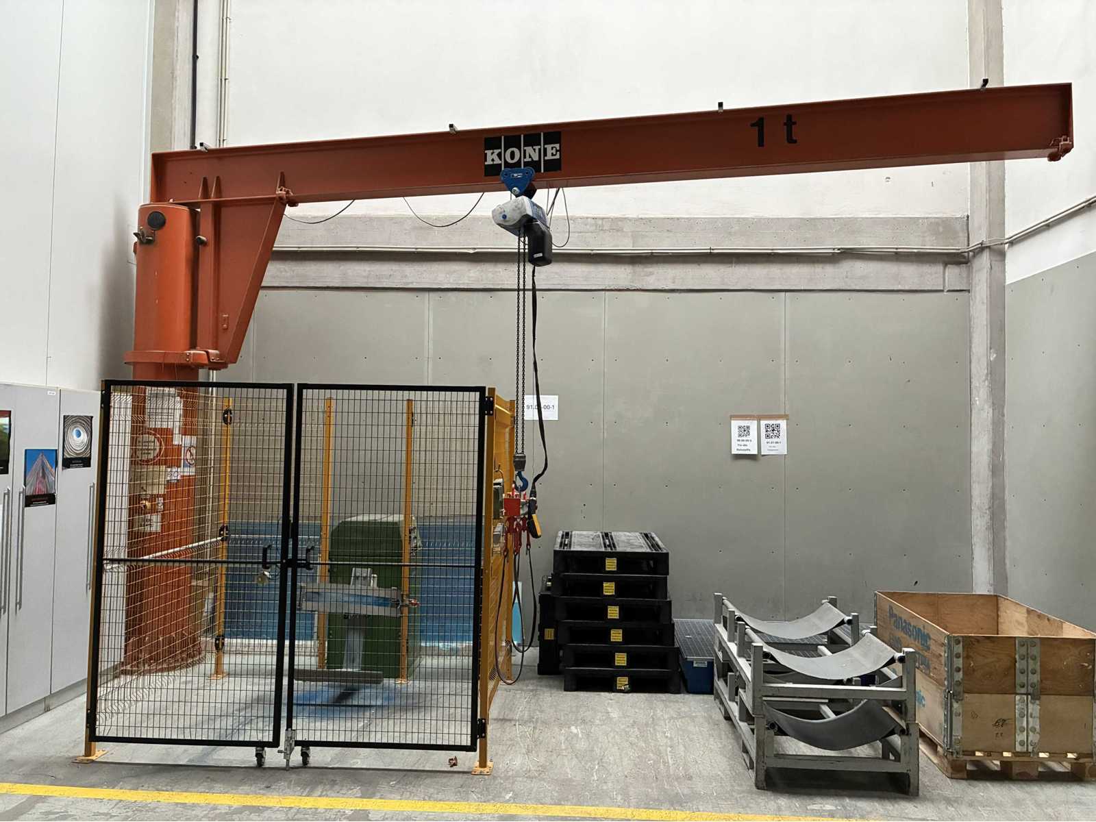 1 ton pillar jib crane, with Kone 1000kg electric chain block with pendulum control, S/No 2065, Year 1985, ANR 1081 Auction-ID: A1-45187-233
