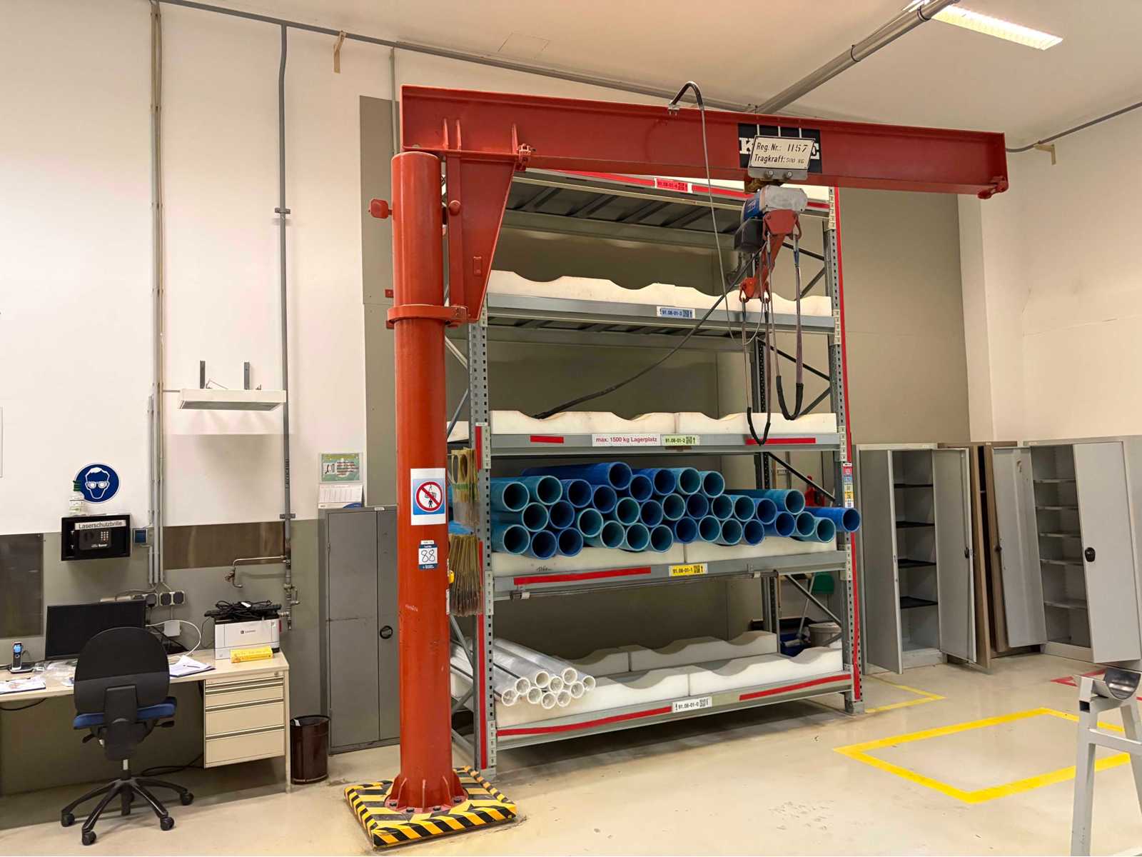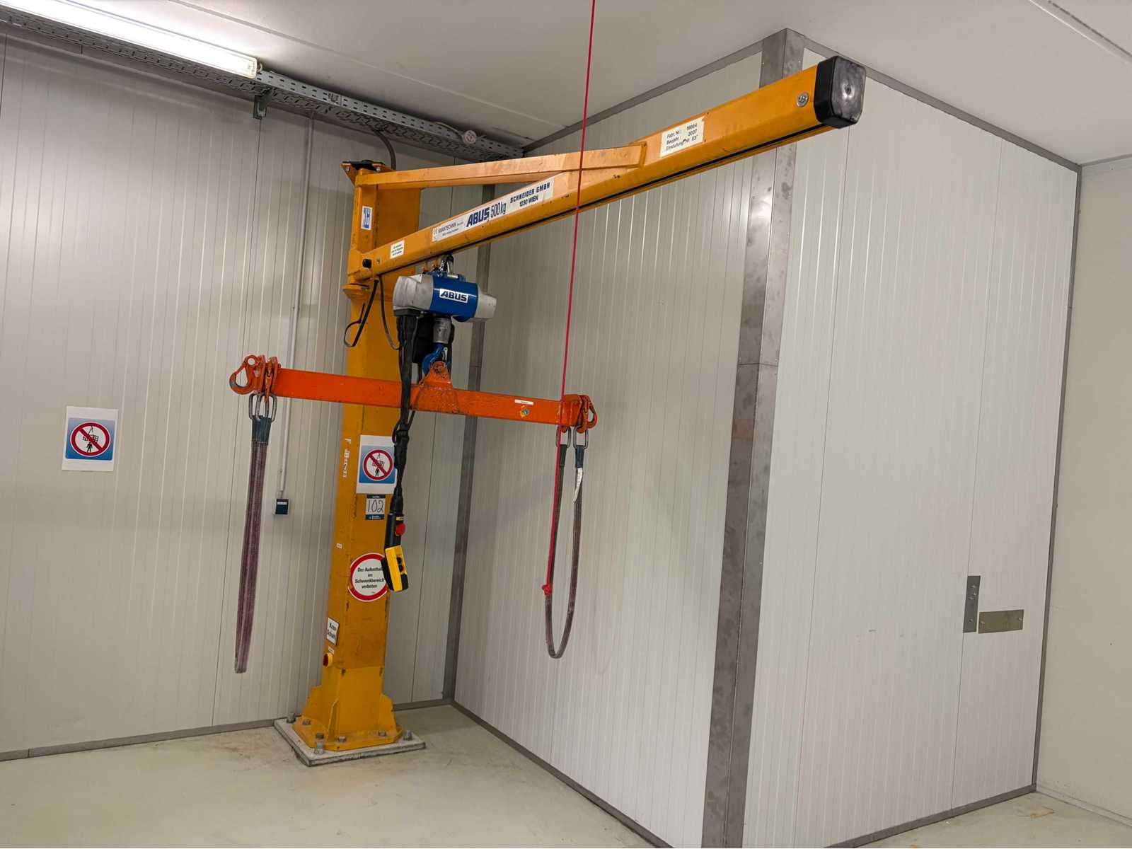 500kg capacity freestanding swing jib crane. Jib height 2.3m, jib length 2.8m. Bolted to ground. Fitted with ABUS GM 2500/4-2 electric chain hoist, 500kg capacity, S/No 220-028478, year 2006. Asset No ANR 2159. Jib S/No 19064. including lifting beam attachment Auction-ID: A1-45187-102