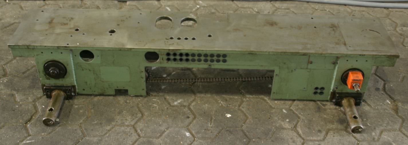 Unit carrier, clamping plate traversing table, for unit construction kit, format processing unit, cutting unit, milling unit, profile milling unit, jointing milling unit, trimming unit, double-end profiler, edge processing machine, scoring motor, chipper motor, milling motor for edge processing machine -HOMAG unit carrier for milling units -with heavy leadership -laterally movable -with counter -Table height: 278 mm -Table surface: 1600 x 295 mm -Table thickness: 18 mm -Price: per piece -Number: 2x available -Dimensions: 1600/295/H278 mm -Weight: 170 kg
