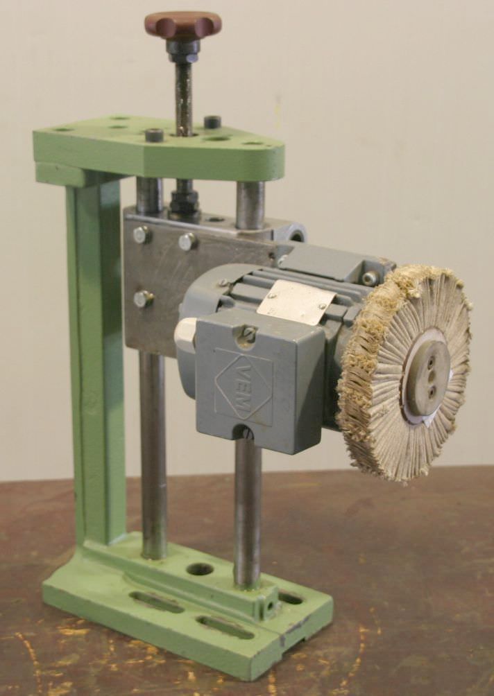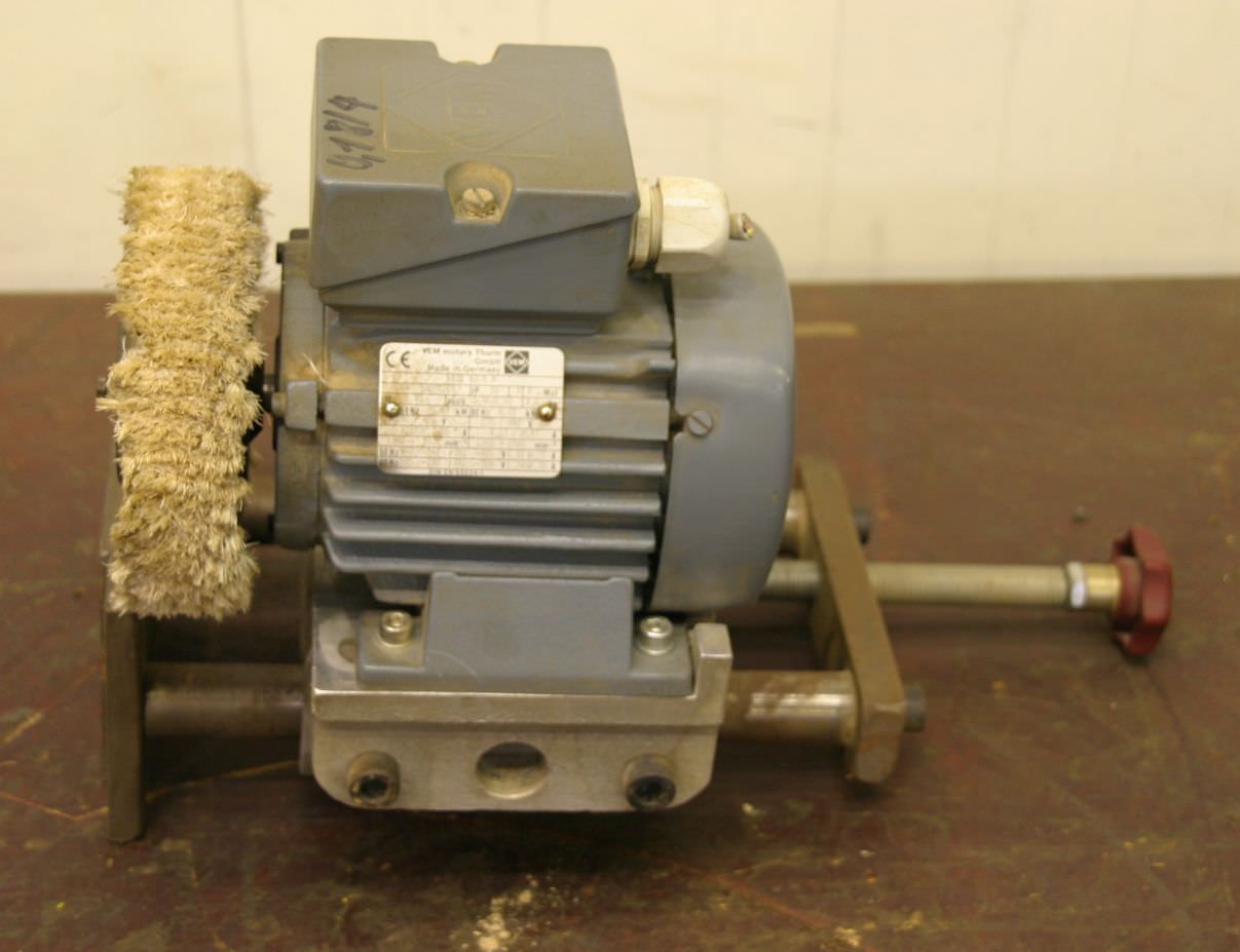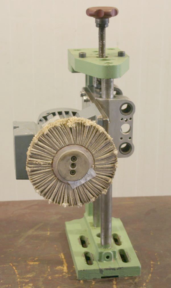 Finishing unit, buffing unit, modular unit, format processing unit, double-end tenoner, edge processing machine, after the scraper for edge processing machine -HOMAG finishing unit for cleaning agent application with buffing wheel for removing glue residue from PVC edges -Motor: 0.18 kW -Speed: 1400 rpm - laterally adjustable -Height: adjustable -Number: 1x aggregate available -Price: per piece -Dimensions: 270/440/H600 mm -Weight: 31.5 kg