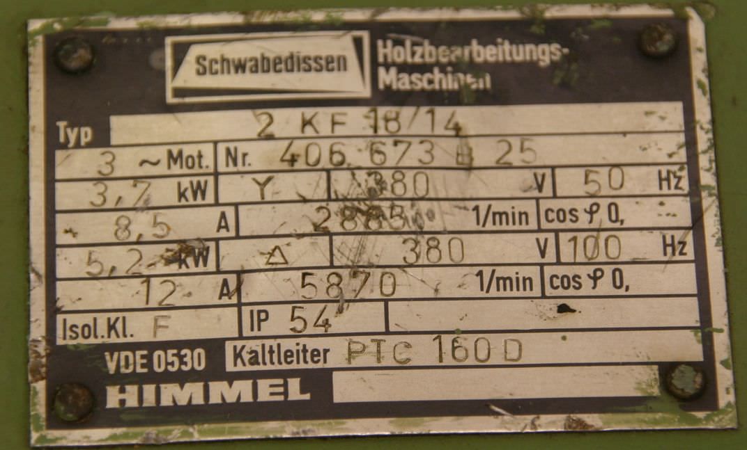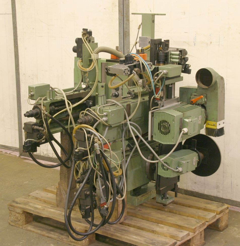 Modular unit, format processing unit, cutting unit, milling unit, profile milling unit, jointing milling unit, trimming unit, double-end profiler, edge processing machine, scoring motor, chipper motor, milling motor for edge processing machine -The four-motor HOMAG profile milling units ensure corner rounding even when processing veneer -for rounding edges on the workpiece front and rear edge above and below -4x engines Perske -Power: 1.5 kW -Voltage: 165 volts -Frequency: 300 Hz -Speed: 18000 rpm -Weight: 374 kg