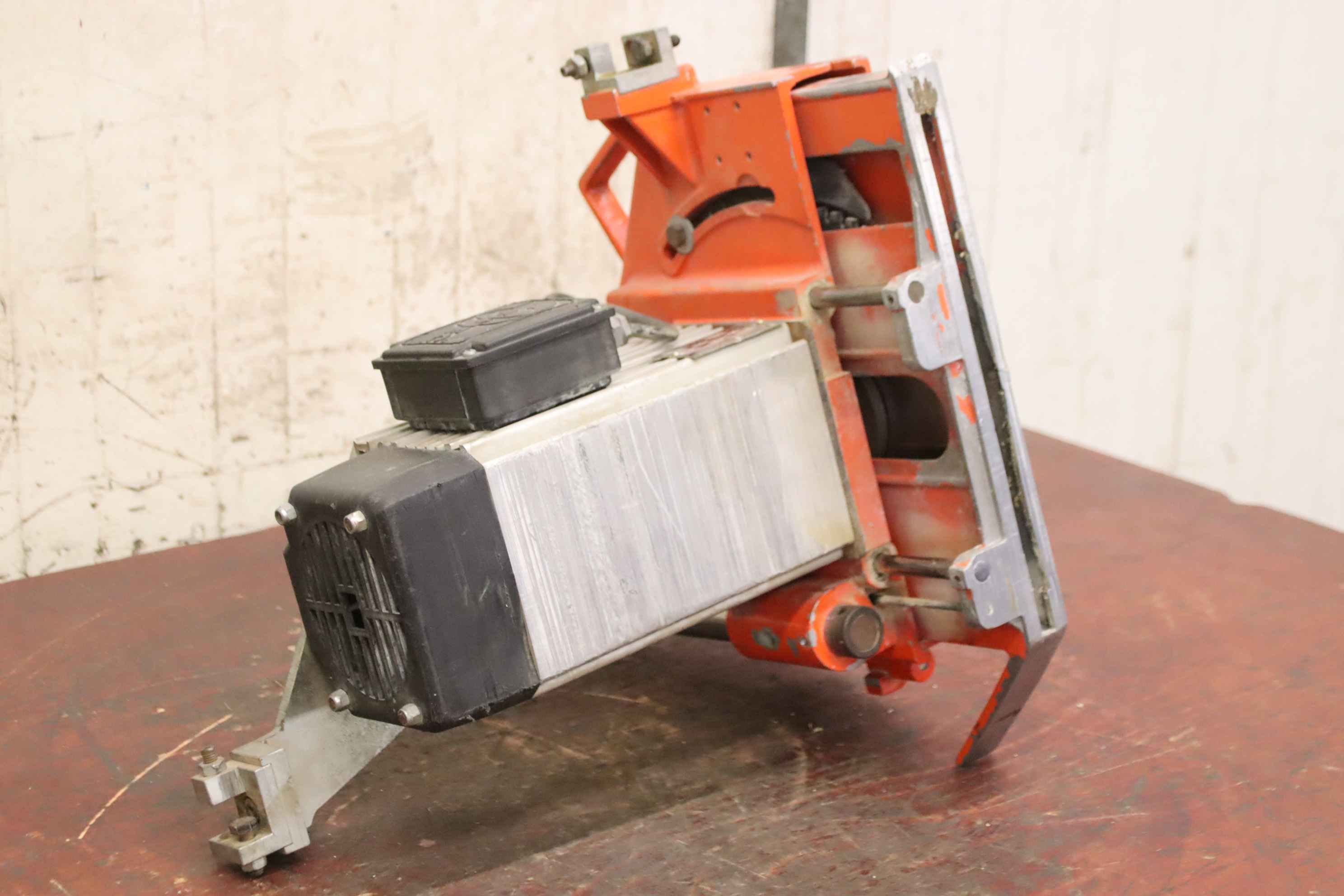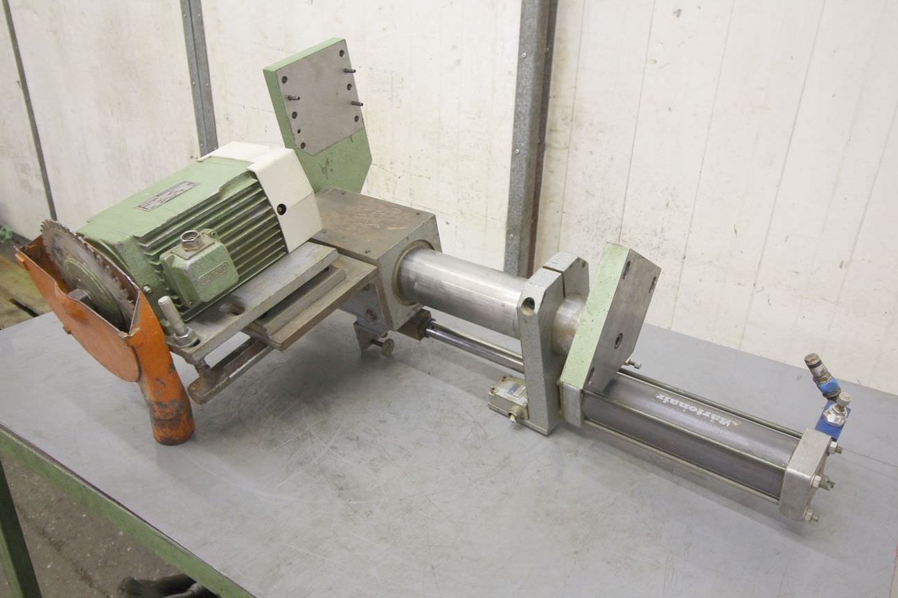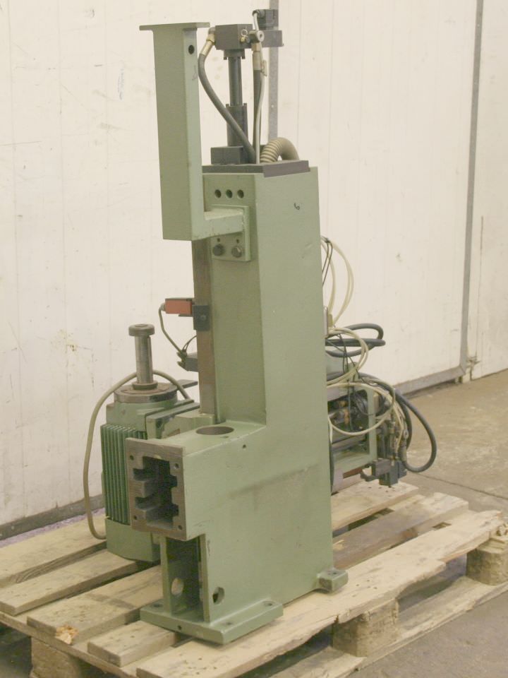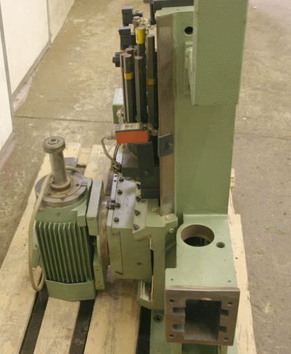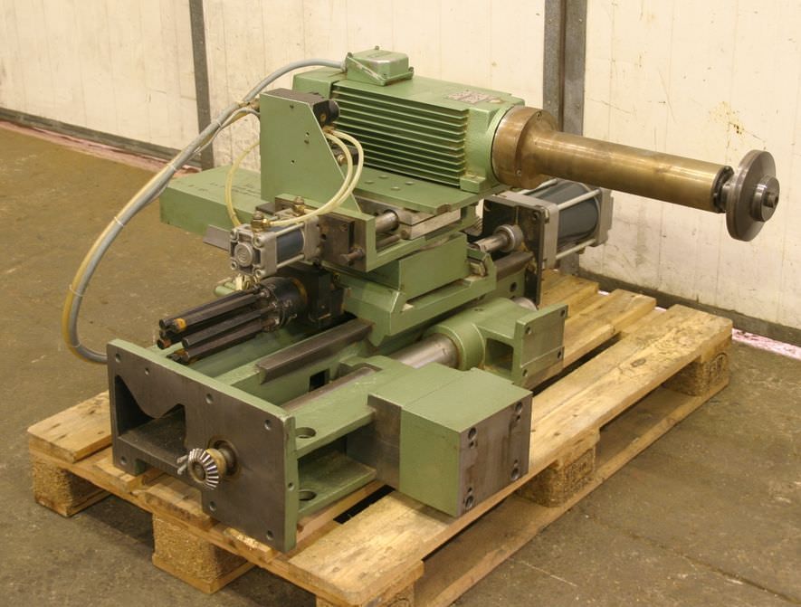 Aggregate kit, format processing unit, chipping unit, milling unit, form milling unit, jointing milling unit, trimming unit, double-end tenoner, edge processing machine, scoring motor, chipping motor, milling motor for edge processing machine-Manufacturer: Homag, milling unit for edge processing machines with Perske motors-Milling units: pivoting-Engines: 2 x Perske VS 31.09-2 / DVMS 903/2-Power: 0.4 kW-Frequency: 200 Hz-Speed: 11300 rpm-Number: 1x milling unit available-Dimensions: 490/380/H610 mm-Weight: 49 kg