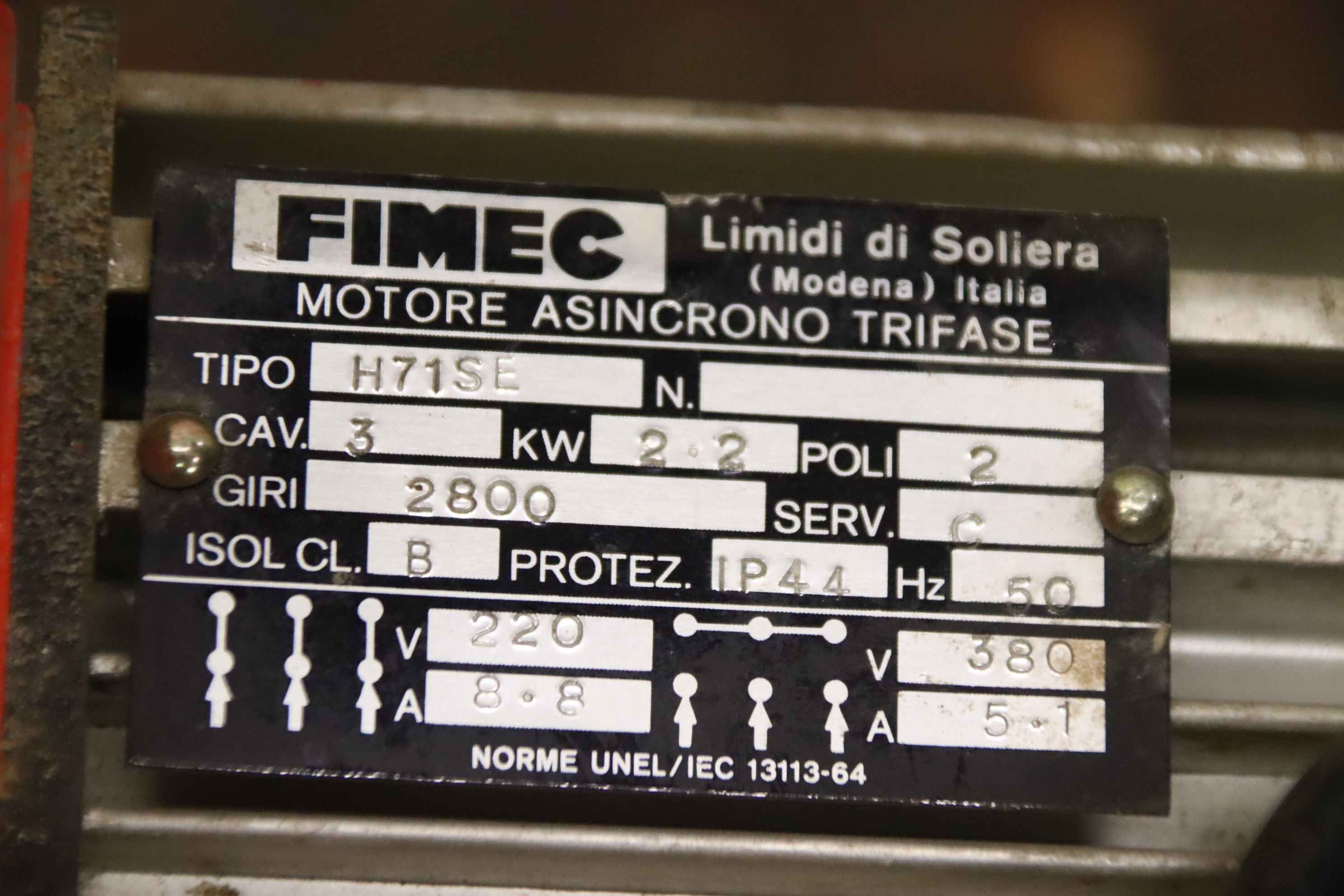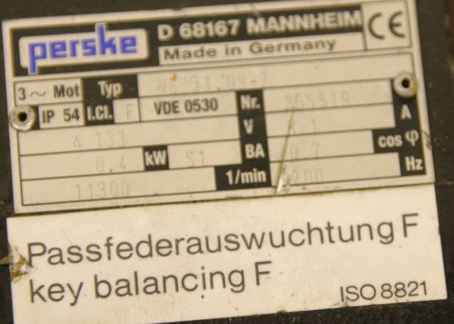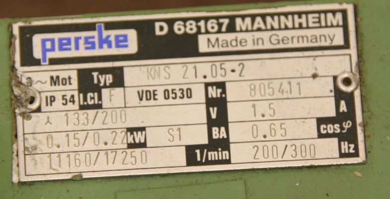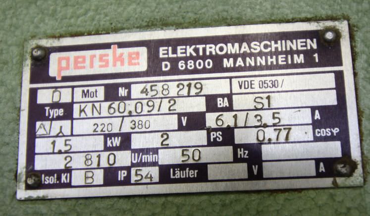 Modular aggregate unit, format processing unit, machining unit, milling unit, form milling unit, jointing milling unit, end-cutting unit, double-end tenoner, edge processing machine, scoring motor, chipper motor, milling motor for edge processing machine -for sawing: edges on the front and back edges of the workpiece -1x: Motor Perske -Type: KN60.09/2 -Power: 1.5 kW -Voltage: 220/380 volts -Frequency: 50 Hz -Speed: 2810 rpm -Dimensions: 900/575/H450 mm -Weight: 112 kg