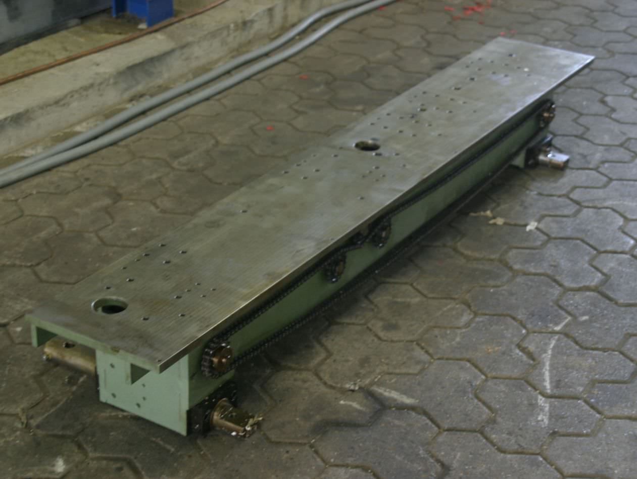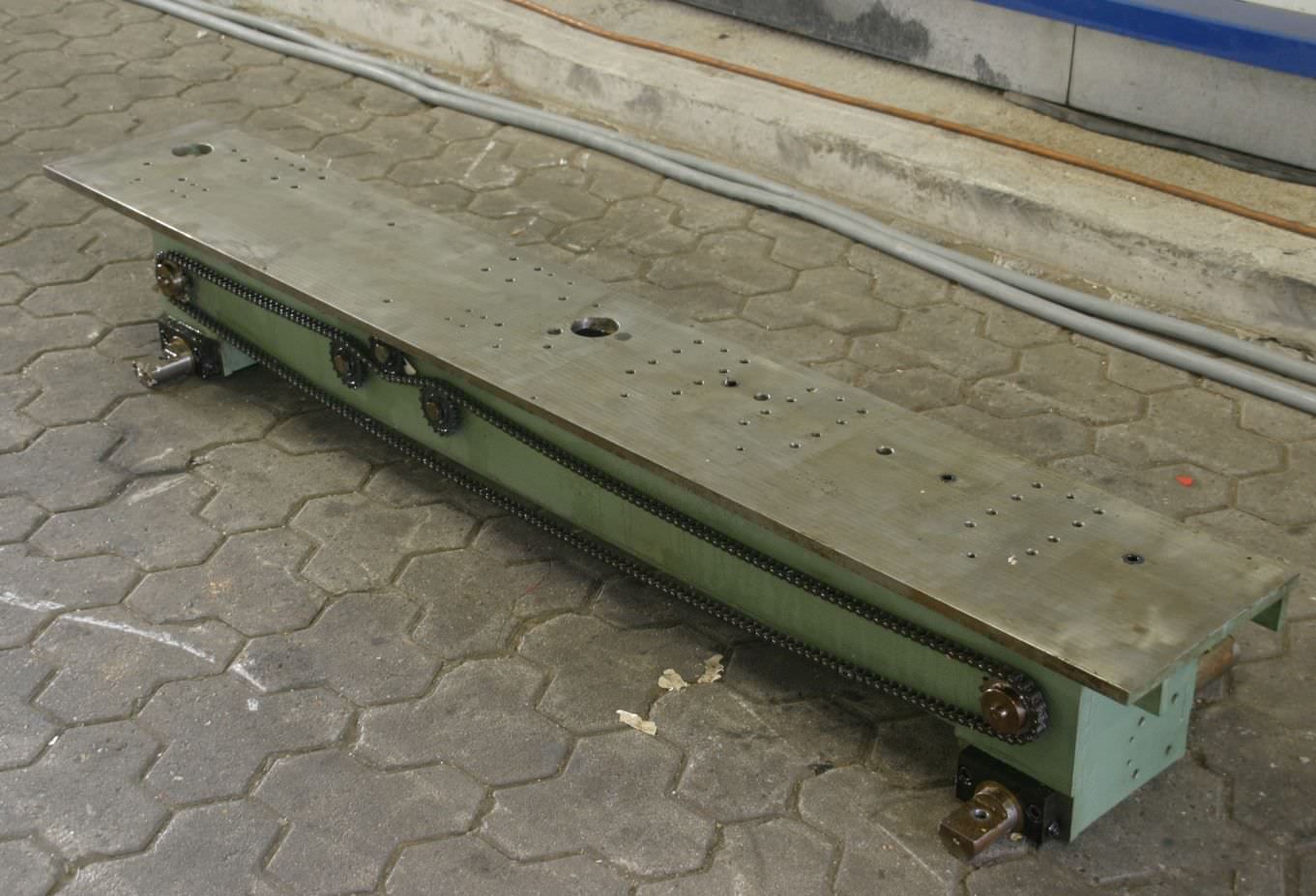 Unit carrier, clamping plate traversing table, for unit construction kit, format processing unit, cutting unit, milling unit, profile milling unit, jointing milling unit, trimming unit, double-end profiler, edge processing machine, scoring motor, chipper motor, milling motor for edge processing machine -HOMAG unit carrier for milling units -with heavy leadership -laterally movable -with counter -Table height: 276 mm -Table surface: 1958 x 295 mm -Table thickness: 18 mm -Price: per piece -Number: 2x available -Dimensions: 1958/295/H276 mm -Weight: 208 kg