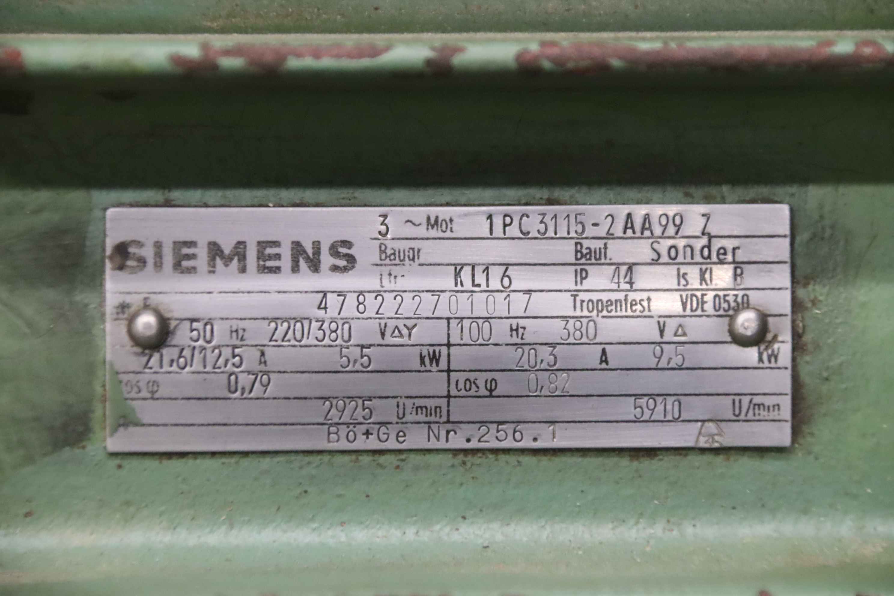 Double-end tenoner, edge processing machine, scoring motor, chipper motor, milling motor, spindle motor, electric motor-Manufacturer: Siemens, milling motor electric motor type 1PC3115-2AA99 Z-Power: 50 Hz 5.5 kW 2925 rpm / 100 Hz 9.5 kW 5910 rpm-Voltage: 220/380 V-Mounting shaft: Ø 35 x 75 mm-Dimensions: 550/280/H235 mm-Weight: 60 kg