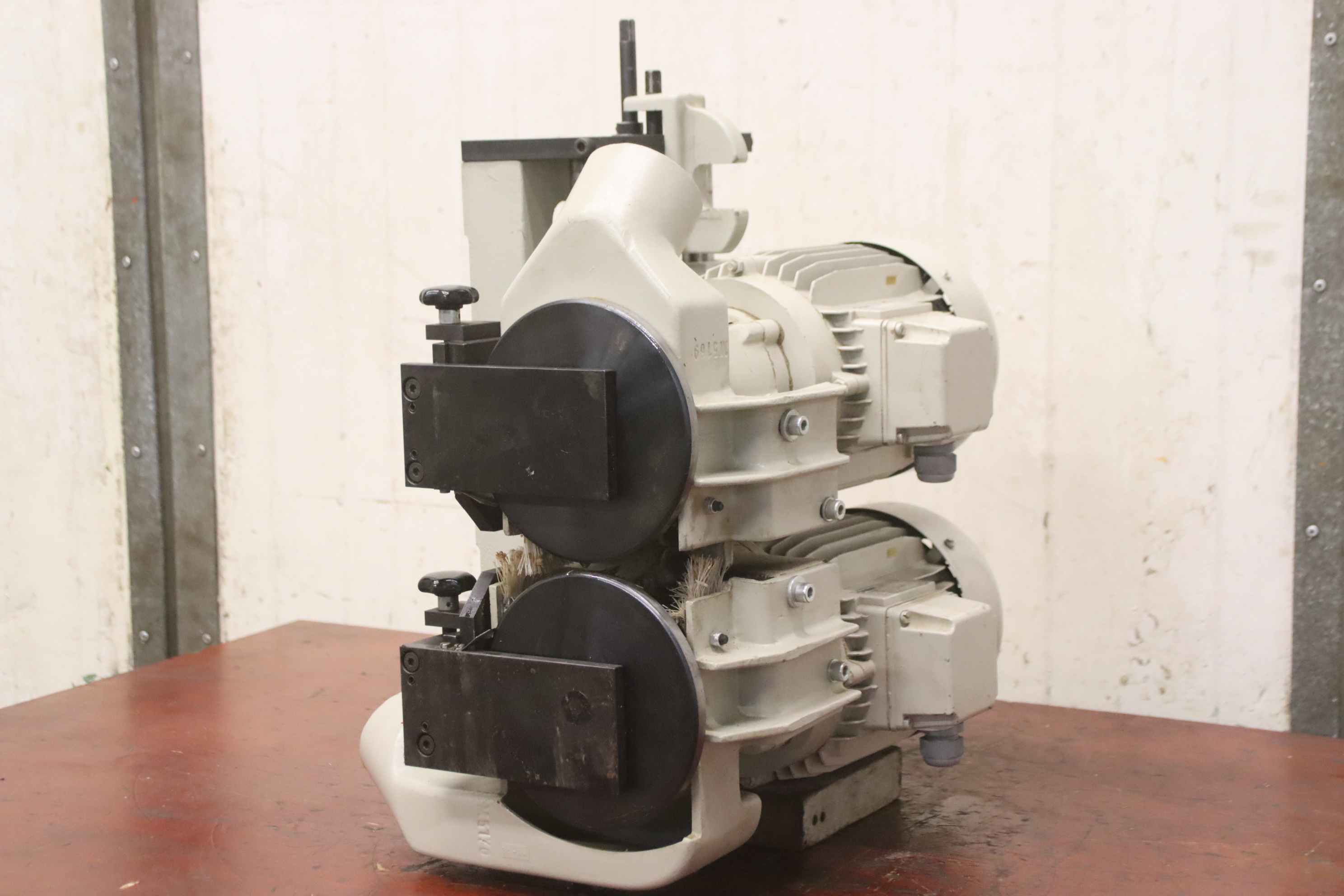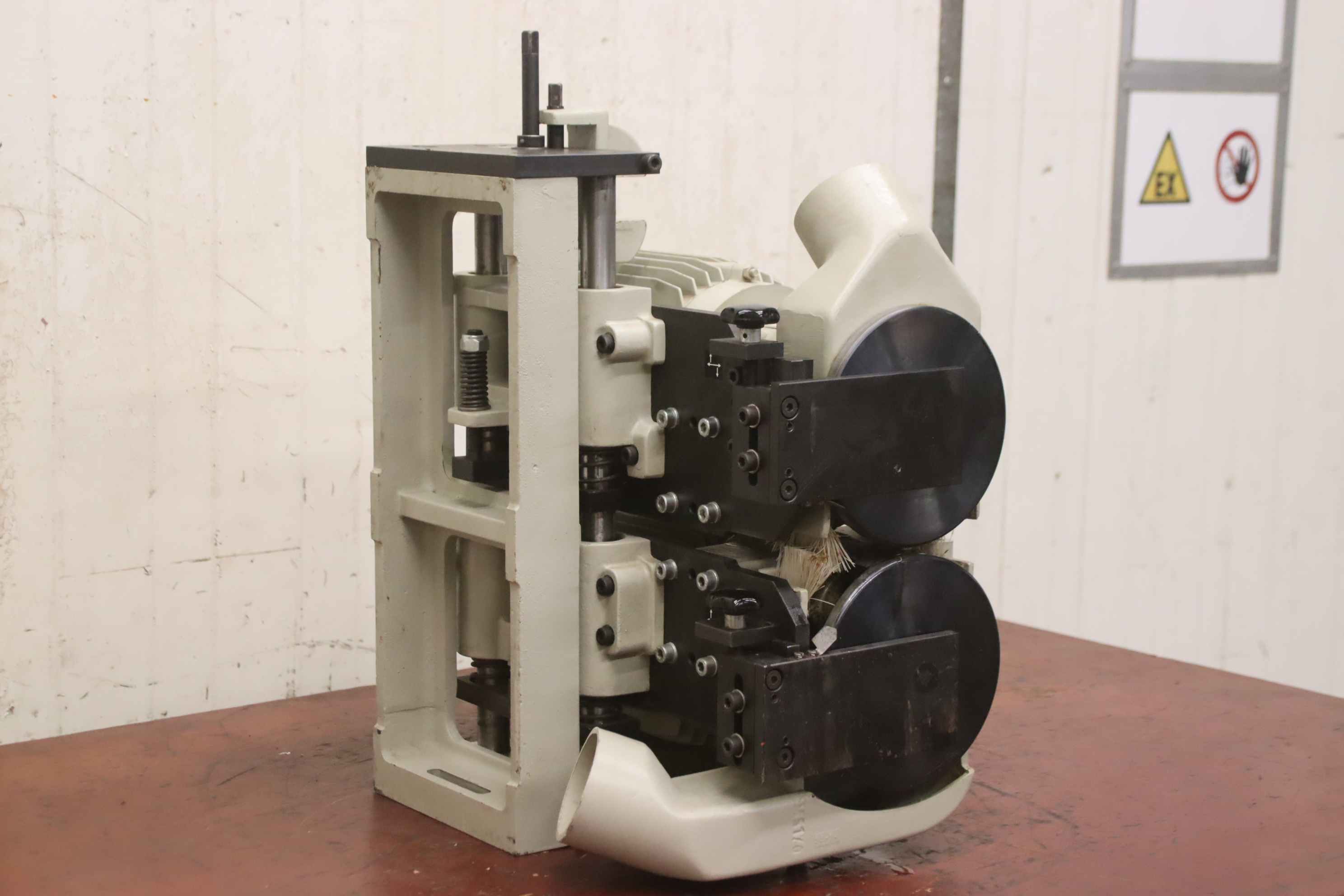 Double-end tenoner, edge processing machine, flush cutter, edge cutter, spindle motor, milling motor-Manufacturer: Paul OTT, milling unit from edge banding machine U 206-Milling motors: Stephan type ZBXD90L20-2 gearbox BMB 46-Power: 2.2 kW-Speed: 12155 rpm-Cutter width: 30 mm-Adjustment range: 0 - 70 mm-Dimensions: 460/370/H570 mm-Weight: 89 kg