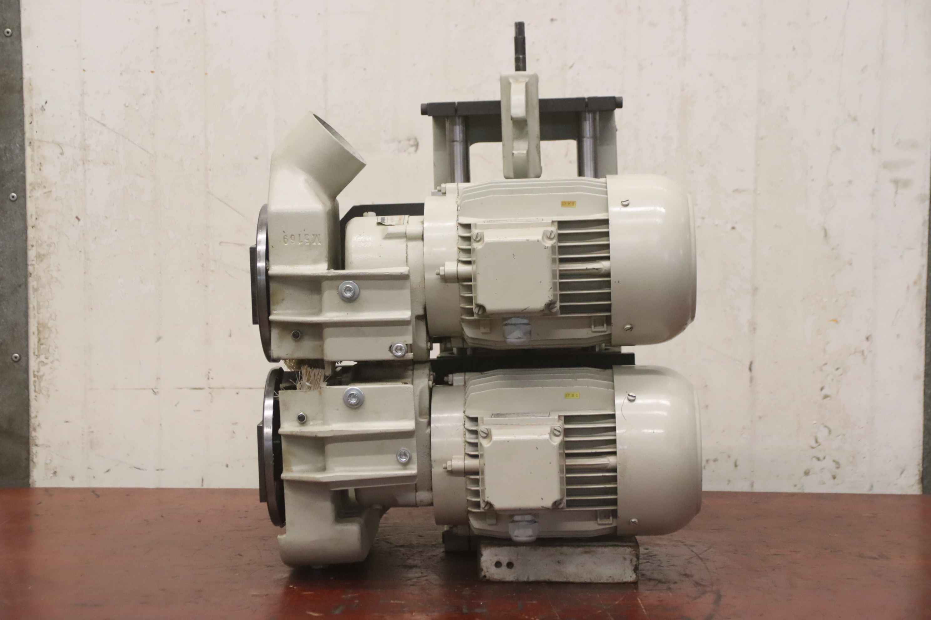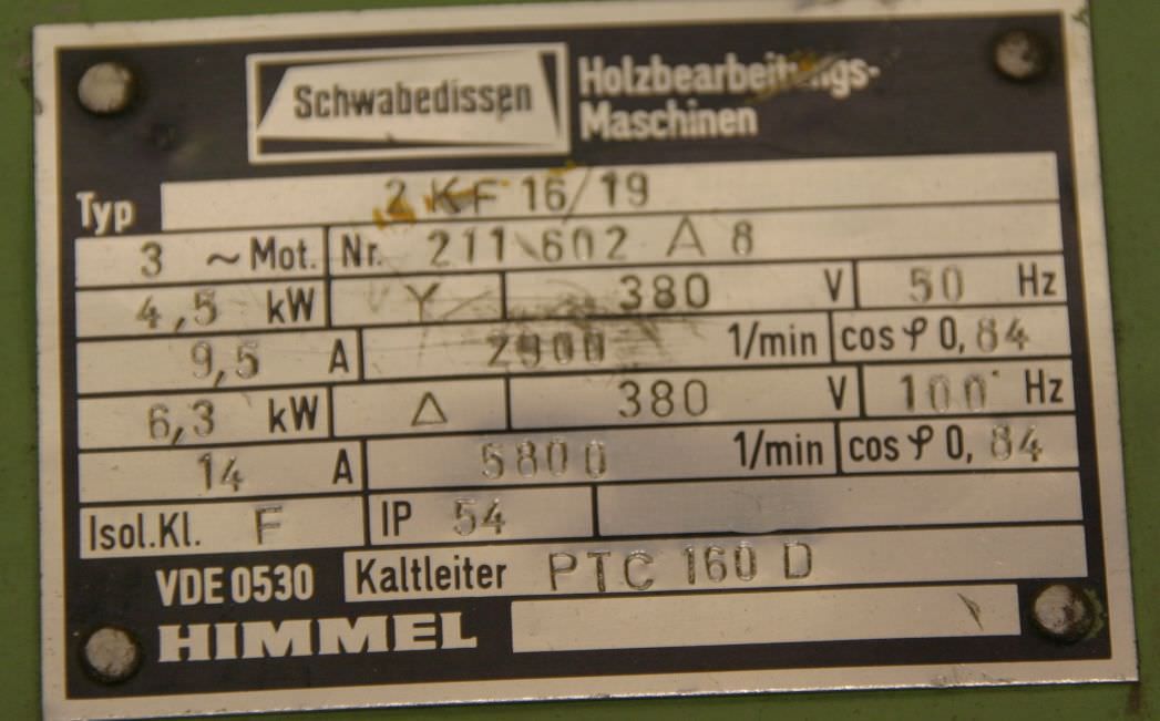Double-end tenoner, edge processing machine, scoring motor, cutting motor, electric motor, spindle motor, milling motor -Unfortunately, no type plate, therefore data approx. -Power: 3.7 kW 2885 rpm at 50 Hz -Power: 5.2 kW 5870 rpm at 100 Hz -Voltage: 380 volts -Receiving shaft: Ø 40 mm -Tool: Ø 165 x 10 mm -Dimensions: 500/250/H160 mm -Weight: 42 kg