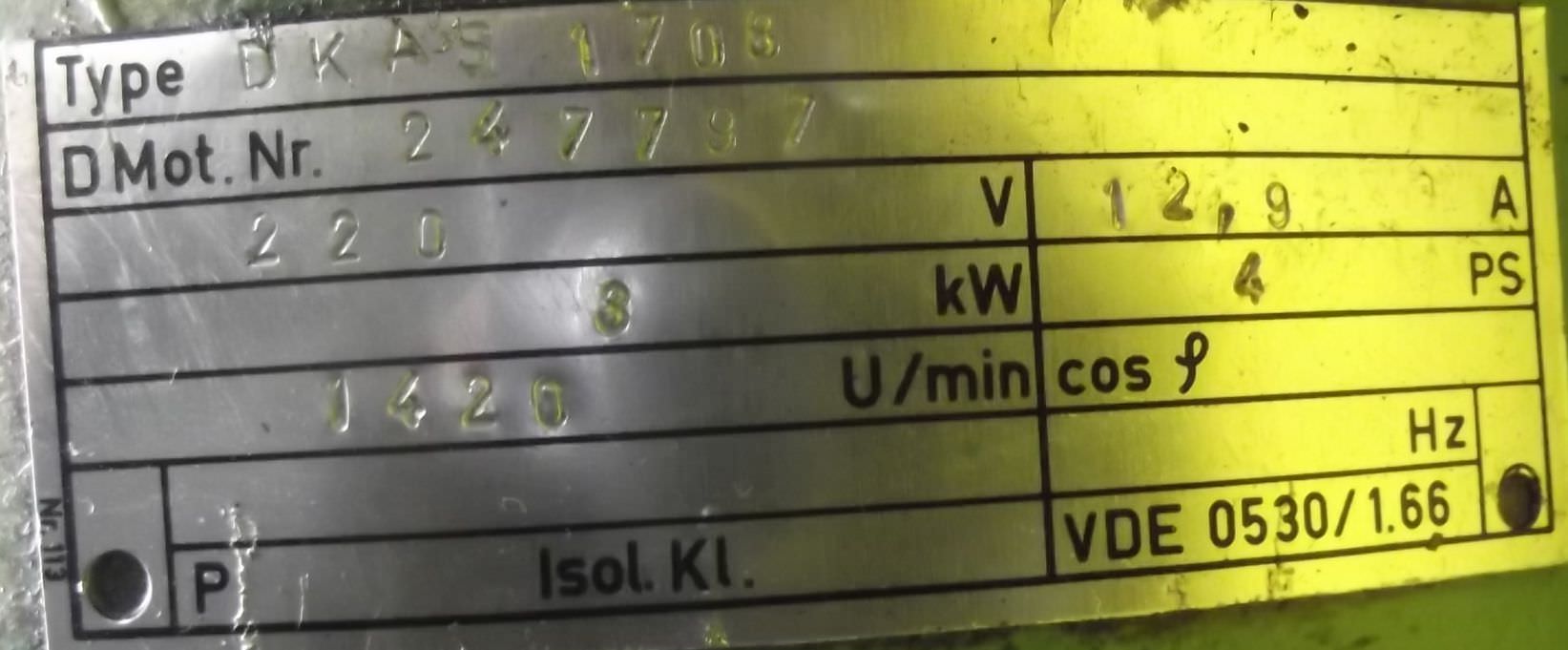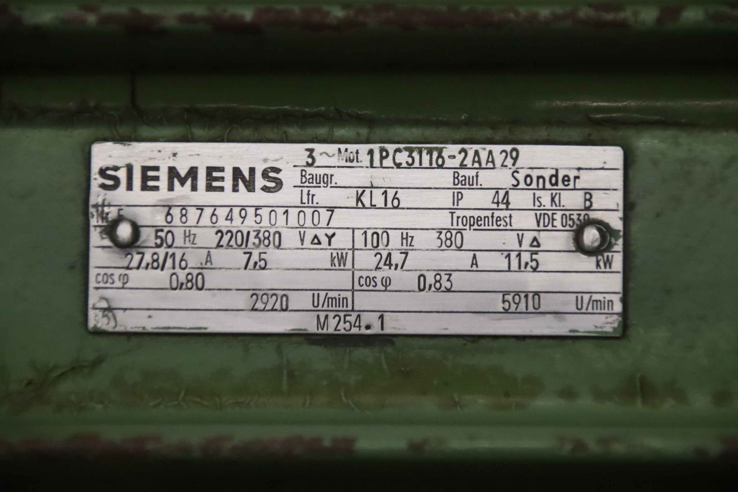 Double-end tenoner, edge processing machine, scoring motor, chipper motor, milling motor, spindle motor, electric motor-Manufacturer: Siemens, milling motor electric motor type 1PC3116-2AA29-Power: 50 Hz 7.5 kW 2920 rpm / 100 Hz 11.5 kW 5910 rpm-Voltage: 220/380 V-Mounting shaft: Ø 35 x 80 mm-Dimensions: 630/280/H195 mm-Weight: 70 kg