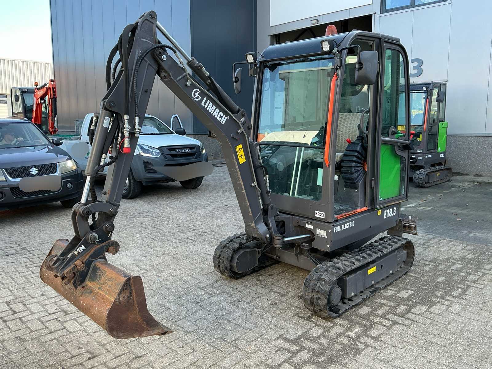Equipped with: 8 hours working range on 30kw batteries. Charging cable, 2 tons. Quick coupler CW05, 2 valves on boom, extendable tracks, alarm light, LED work light, Limach E18.3 SD-P (2022) fully electric mini excavator, 8 kW electric motor, machine weight 1,970 kg, enclosed cab, rubber track undercarriage, hydraulic quick coupler with bucket, serial number E1820005B80-58 Auction-ID: A1-40132-25