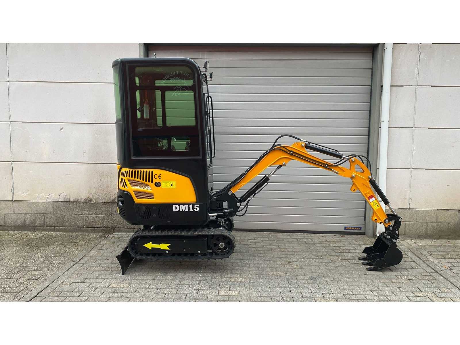 Machine type: DM15/cabinette Engine type: Diesel engine, 2 cylinders Engine size: 11 HP, 8.3 kW, 12 RPM Engine manufacturer: KUBOTA (Z482) Starting system: Electric with key Drive: Fixed Tracks Speed V/A: +- 3.5 km/h Swivel digging arm: 70 degrees (left & right) Swing radius: 360 degrees Max. inclination angle: 30 degrees Braking system: Automatic safety brake Gross weight : +- 1500kg Net weight : +- 1400 kg Model Number: DM15PRO Auction-ID: A3-43507-21212