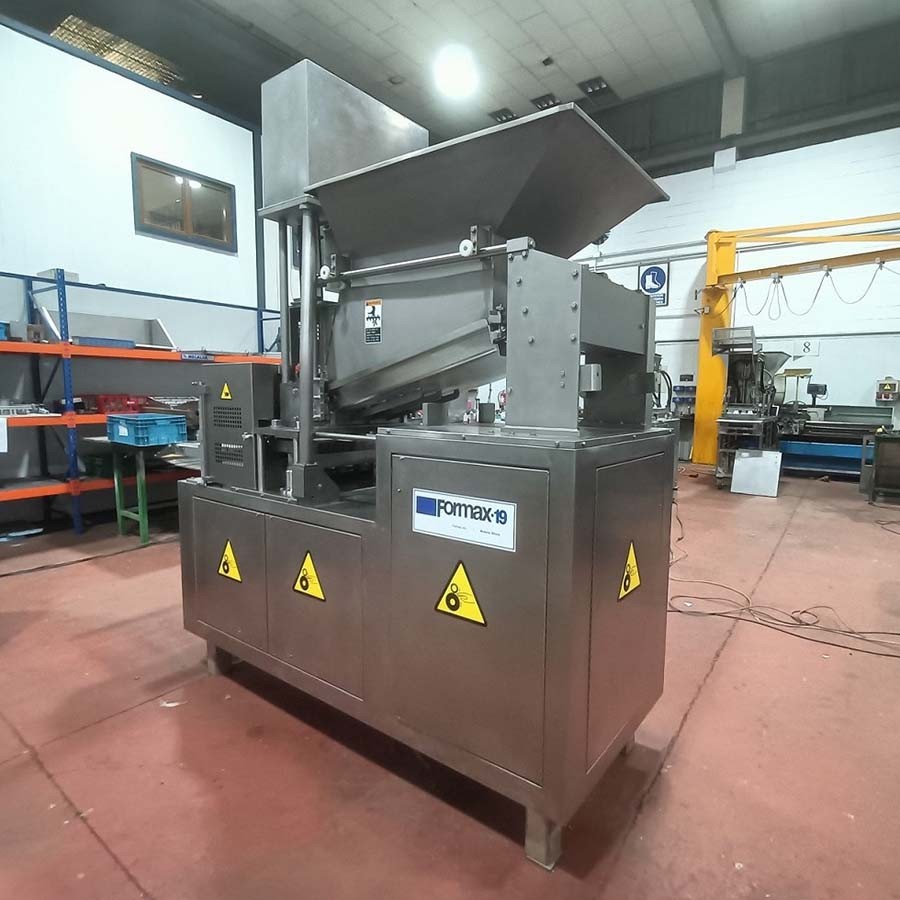 FORMING MACHINE, FORMAX TYPE: PFM-19 Technical description: Serial number: 416 Power supply: 380 V, 3 Ph, 50 Hz, 27.6 kVA, 42 A Conveyor width: 550 mm Format diameter: (3x) 120 mm Dimensions: 3000 x 1000 x 2700 mm The Fl9s hydraulic injection forming system offers extremely accurate weight control and the ability to manufacture a wide range of products at different temperatures. It achieves high performance and forms products with a natural texture and excellent appearance.