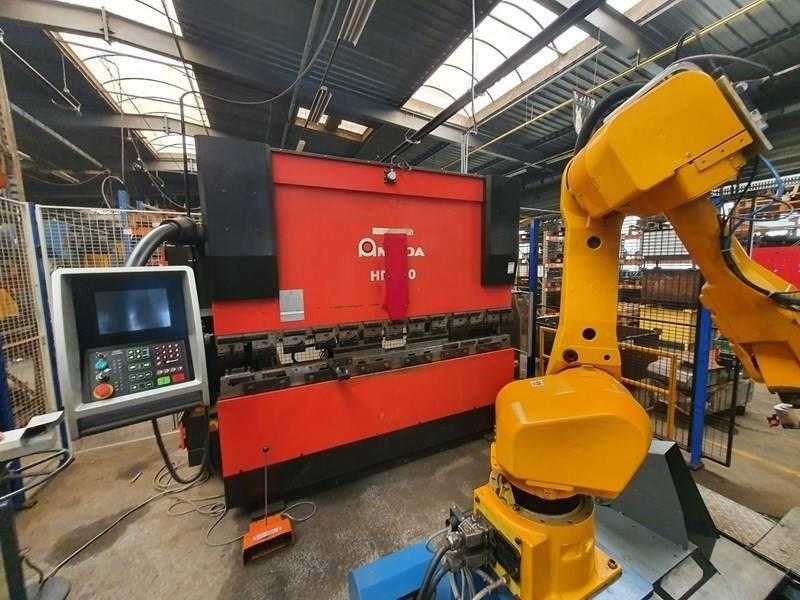 AMADA – Press Brake with Automated Robot Line General data: Manufacturer: Amada Capacity: 80 t Working length: 2700 mm Displayed hours: 23029 h Motor power: 9 kW Machine weight: 5750 kg Dimensions (L x W x H): 3400 x 2030 x 2530 mm Technical details: Electric backgauge: yes Maximum stroke: 200 mm Description: Modified complete automated production line consisting of a press brake and industrial robot system. The installation includes a FANUC ArcMate 120iB robot mounted on a rail, equipped with protective enclosure for safe operation. Additional information: External access for robot integration (details to be confirmed). Auction-ID: A7-45351-1