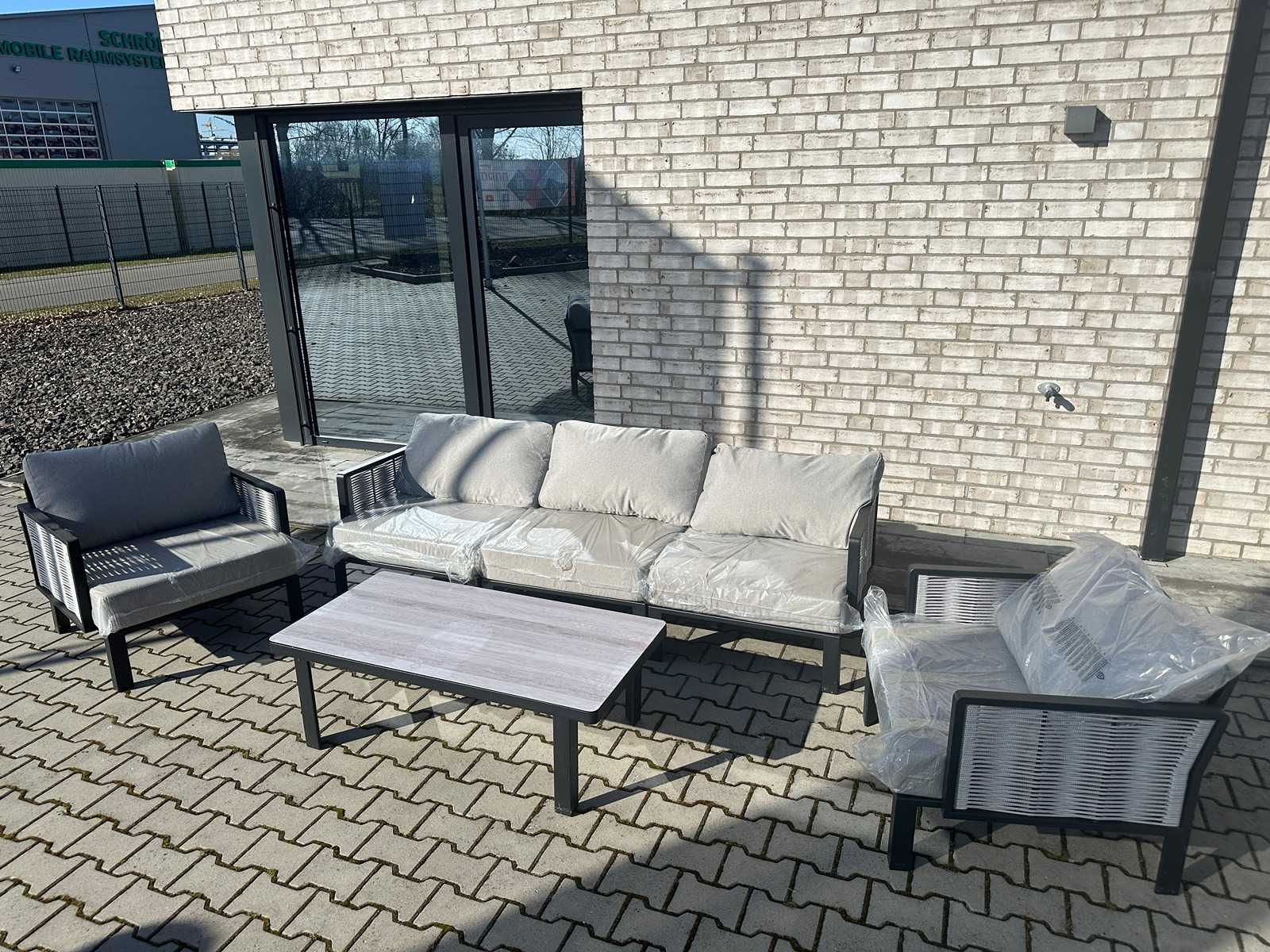 Modern outdoor lounge set in a timeless design - ideal for the terrace, garden or pool area. The combination of dark aluminium frame, grey wicker and matching upholstery creates an elegant, high-quality look. Auction-ID: A7-45369-19