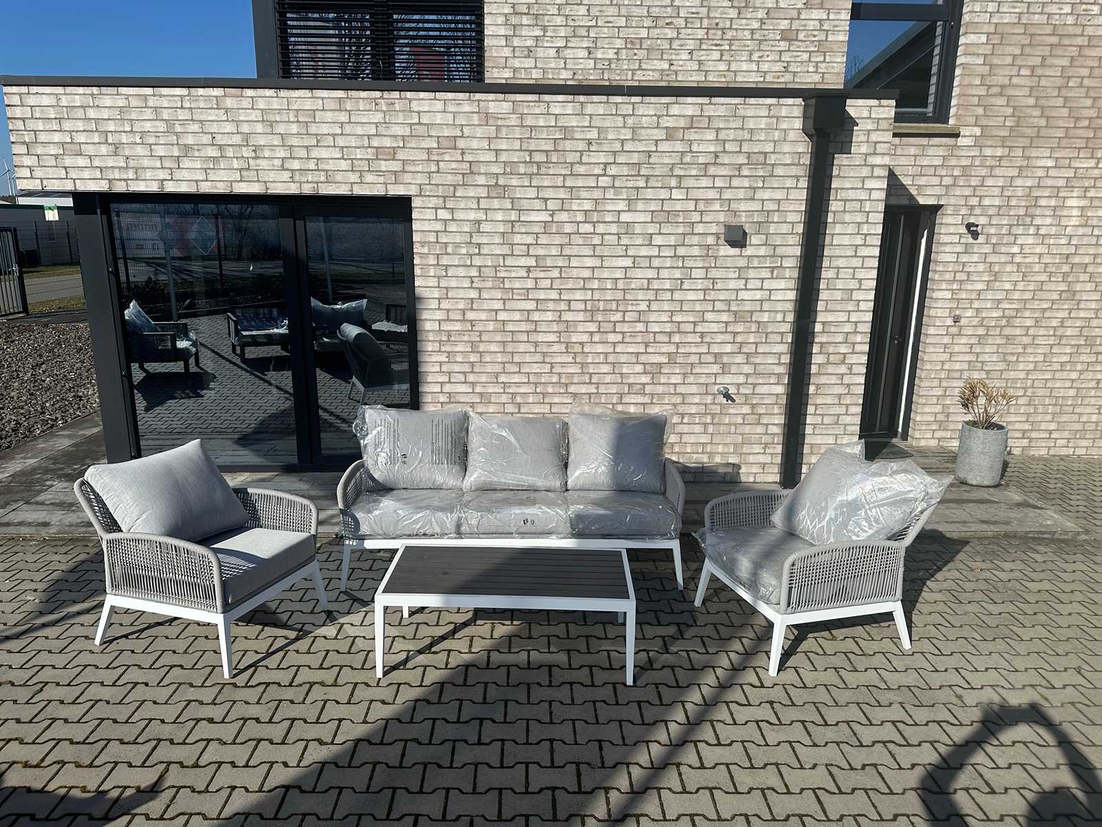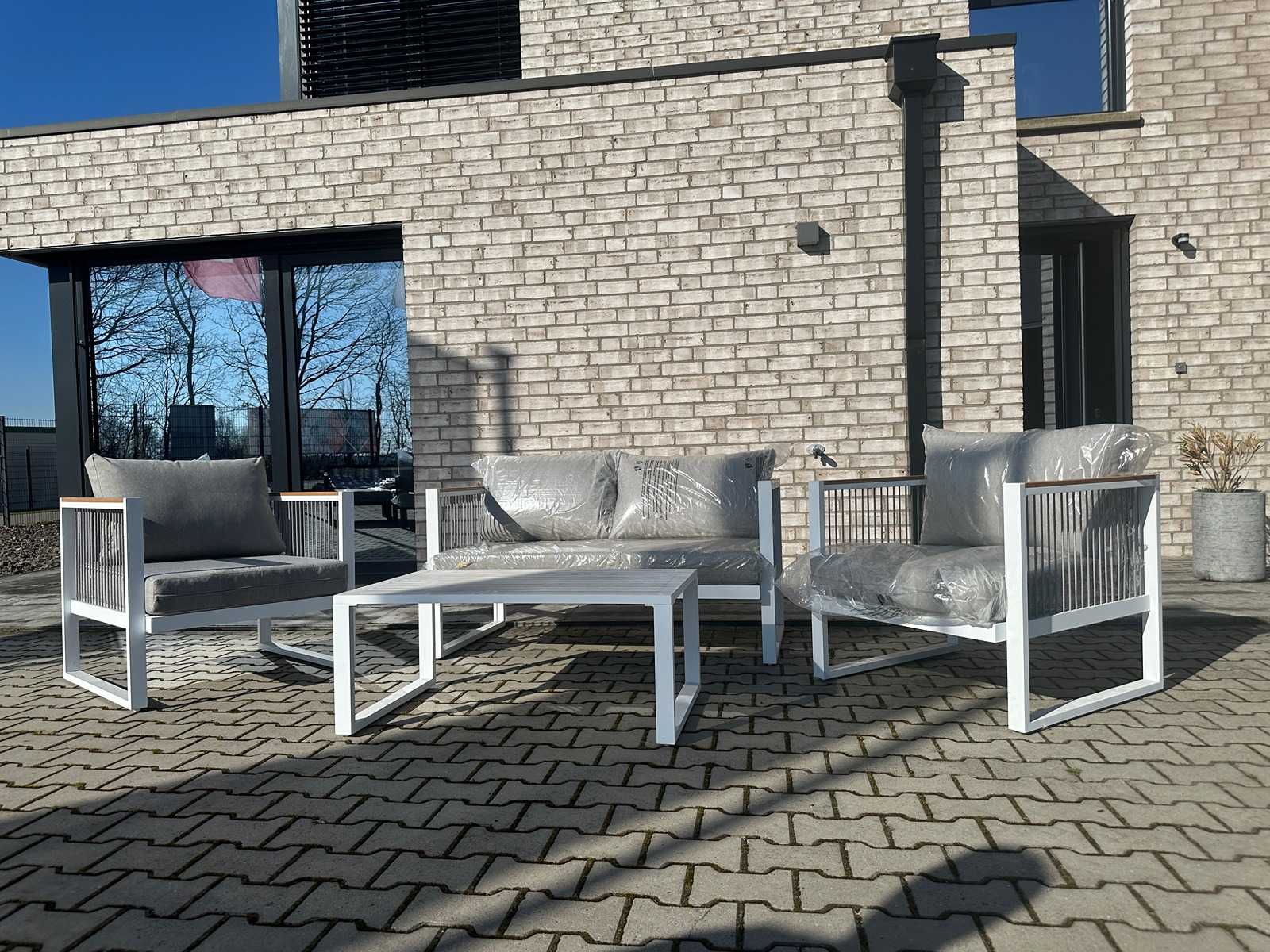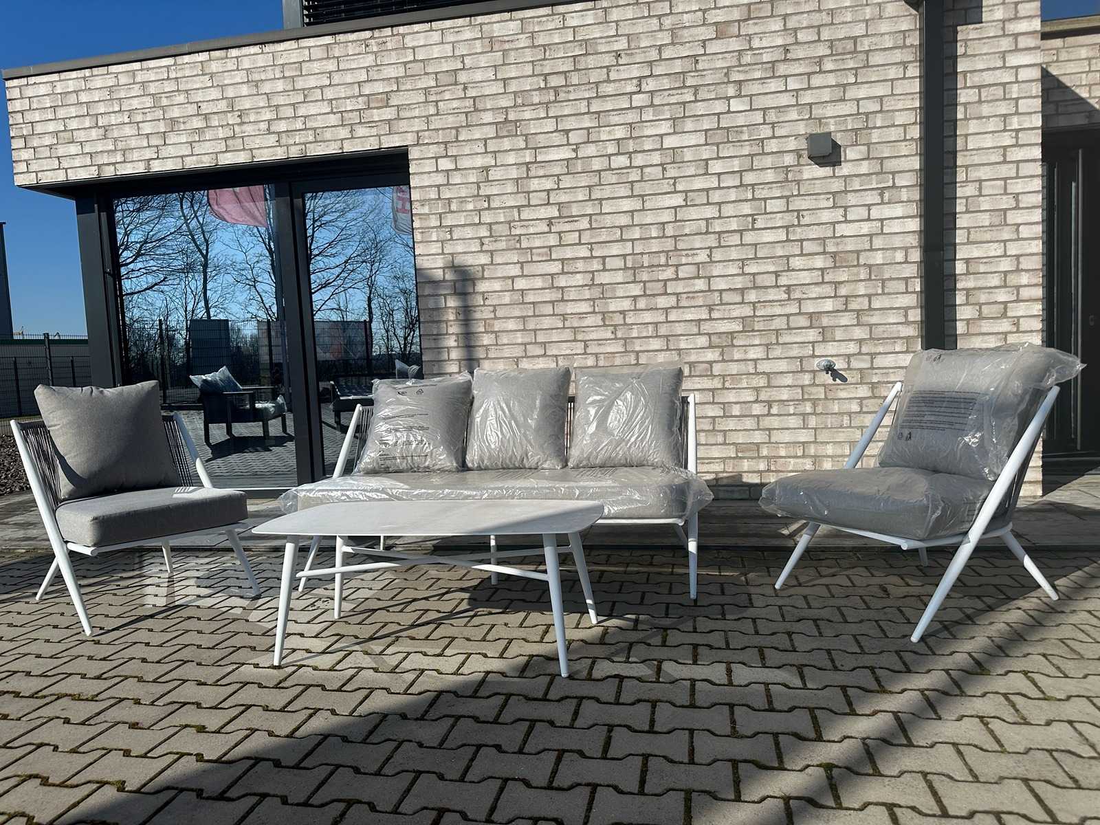 Modern outdoor lounge set in a timeless design - ideal for the terrace, garden or pool area. The combination of a light aluminium frame, grey wicker and matching upholstery creates an elegant, high-quality look. Auction-ID: A7-45369-29