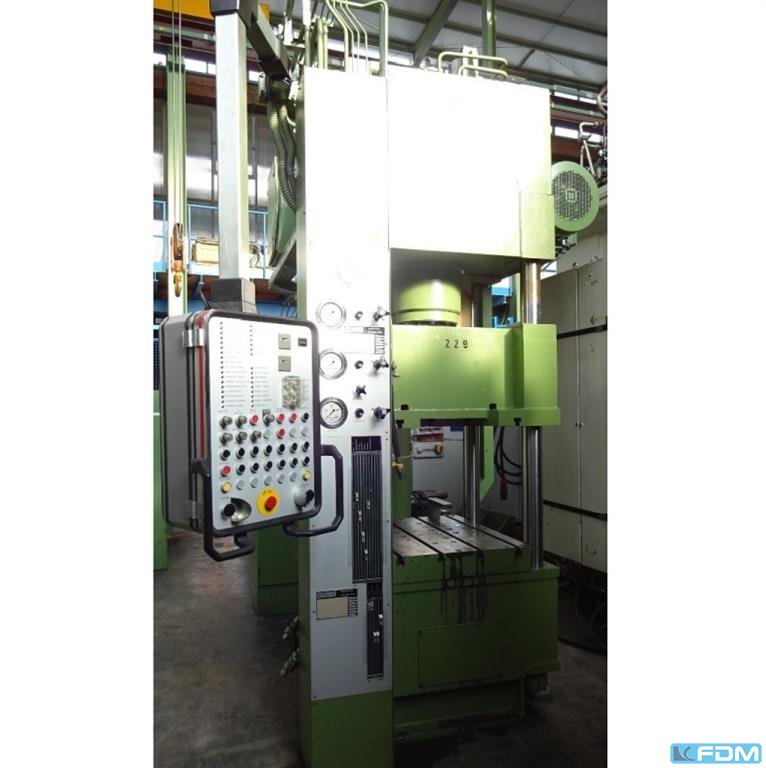 Pressure:63 t distance between columns:1000 mm stroke:300 mm Distance table/ram, max. stroke up, adjustment up:850 mm table surface area:980 x 500 mm table height above floor:850 mm ram surface:130 mm speed down:400 mm/s speed up:461 mm/s working speed:14 - 97 mm/s power requirement:15,0 kW Weight:5,0 t Dimensions (WxDxH):2,0 x 1,6 x 3,9 m depth stop:mechanical foundation pit:not necessary