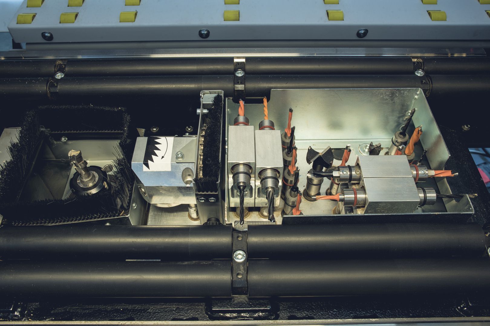 立式独立主轴数: 9 轴 X 上的水平主轴数 : (2+2) 轴 Y 上的水平主轴数量: (1+1) N 1 锯片单元: (ø 100 毫米) 路由器头 3,6 Kw ISO 30 - 12000/24000 rpm 面板最大厚度:50 mm 控制:完全参数化 面板最大重量:Kg 25 最大面板尺寸: X ,Y 1100, Z 50 mm 最小面板尺寸:X 270,Y 150(70 op.),Z 12mm 控制轴数:3 面板送料速度:25米/分钟 主轴转速旋转: 3600 rpm 锯片转速旋转: 7000 rpm 气压: 7 巴 除尘直径: ø 140 mm 排气调节: (2000 微克/或拉) - (30 米/秒) 最大钻孔深度(以堀为单位)。在 X 轴和 Y 轴上: 30 mm 垂直最大钻孔深度: 45 mm 刀具最大水平直径:12 mm 刀具最大垂直直径:35 mm 电机功率: 1,5 kw 最大耗气量:60牛顿/分钟 总功率 : 6,4 Kw 尺寸: 2520x1600x1680 m ...