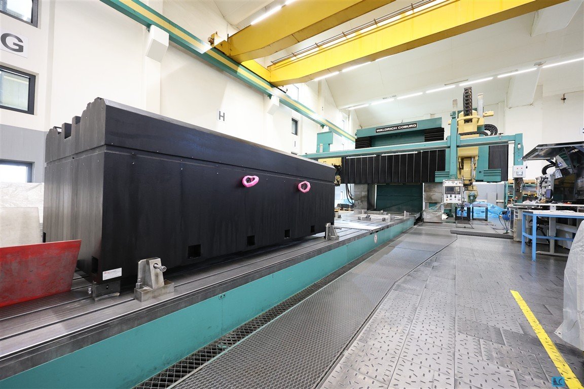 An old plano milling machine (guideway grinding machine) Waldrich Coburg is available. Bed length: 5500mm, bed width: 750mm, machine dimensions X/Y/Z: approx. 12000mm/300mm/3000mm, weight: approx. 37500kg. An on-site inspection is possible.