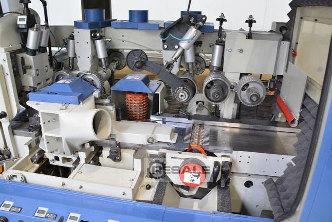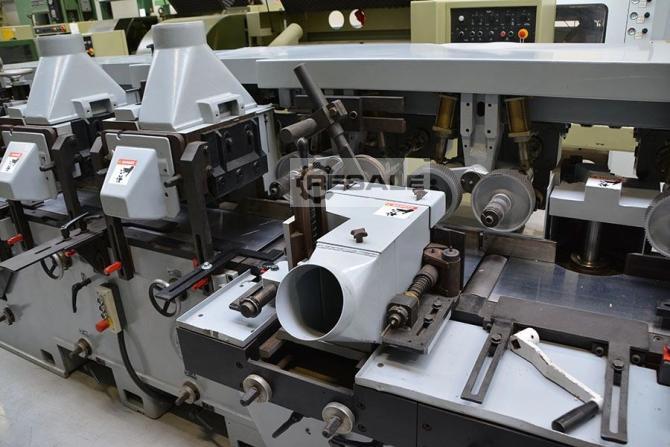 工作宽度 250mm 工作高度 140mm 8 头 3 个带齿滚子,位于进料口的台面上 头部排列:下/右/左/右/左/上/上/下 无级变速进给速度高达 80 米/分钟 主轴直径 50mm 两侧支撑主轴 万向轴进料 主轴转速 6000 rpm 气动拉辊夹具 在两个轴上调整头部 铸造