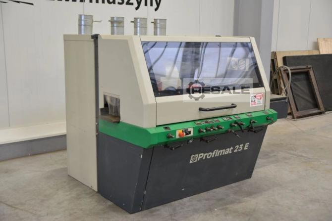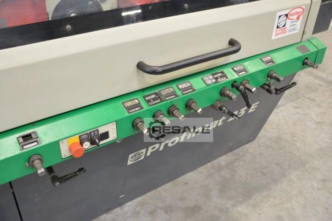 Piallatrice e scorniciatrice Profimat 23 E Larghezza di lavoro: 230 mm Altezza di sollevamento: 120 mm Lunghezza della toeletta: 2000 mm Disposizione del mandrino 1: Ravvivatura 5,5 kW, 6000 giri/min, diametro 40 mm 2+3 Sinistra+ Destra 7,5 kW, 6000 giri/min, diametro 40 mm 4: Spessore 5,5 kW, 6000 giri/min, diametro 40 mm 5: Inferiore 4kW, 6000 giri/min, diametro 40 mm Motore di avanzamento: 2,2 kW Velocità di avanzamento regolabile in continuo 0-24 m/min Teste di fresatura con calibro di regolazione Potenza totale richiesta: 27 kW Dimensioni allestimento: 3400 x 1650 x 1970 mm Peso della macchina, circa: 3500 kg