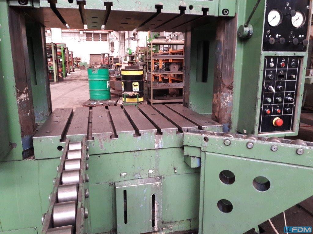 pressure:250 t passage width:1280 mm stroke:bis 500 mm total power requirement:47 kW weight of the machine ca.:23 t dimensions of the machine ca.:2200 x 1850 x 4600 mm table surface area:1250 x 1000 mm dayligth:800 mm daylight between the side columns:520 x 750 mm table height above floor:1000 mm Documents: vorhanden