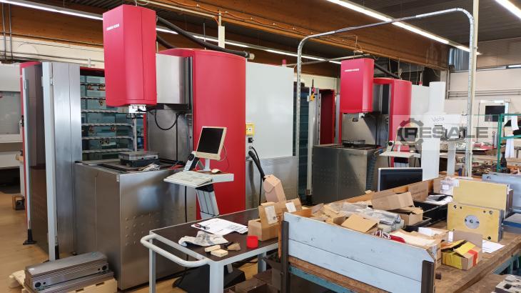 An eroding island consisting of two die-sinking EDM machines and an automation system is available. 1) Zimmer & Kreim ZK Genius 700, year of manufacture: 2015, travel X/Y/Z: 400mm/350mm/350mm, table dimensions X/Y: 575mm/500mm, max. workpiece weight: 700kg, generator output: 96A, path eroding: CIMCO, operating hours: 22056h. 2) Zimmer & Kreim ZK Genius 700, year of manufacture: 2019, travel X/Y/Z: 400mm/350mm/350mm, table dimensions X/Y: 575mm/500mm, max. workpiece weight: 700kg, generator power: 96A, path eroding: CIMCO, operating hours: 8255h. 3) Automation Zimmer & Kreim Chameleon Quad, year of construction: 2015, electrode positions: 176, pallet positions with loading drawer: 9, double rotary gripper for Erowa ITS and single gripper for UPC pallets. Overall system dimensions X/Y: approx. 3000mm/6200mm. Including a Kraft & Bauer fire extinguishing system with suction device. Documenta ...